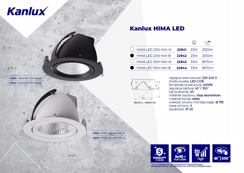 Светодиодные потолочные светильники Kanlux HIMA светильники с высокой светоотдачей (более 110 лм/Вт). Возможность регулировки светильников по двум осям и высокий индекс цветопередачи делают светильники идеальными для мест, где важно отображать определенные зоны и цвета – бутиков, торговых стендов или магазинов большого формата. Kanlux HIMA LED — светильники высокой мощности, поэтому они обеспечат необходимое количество света даже в высоких помещениях.