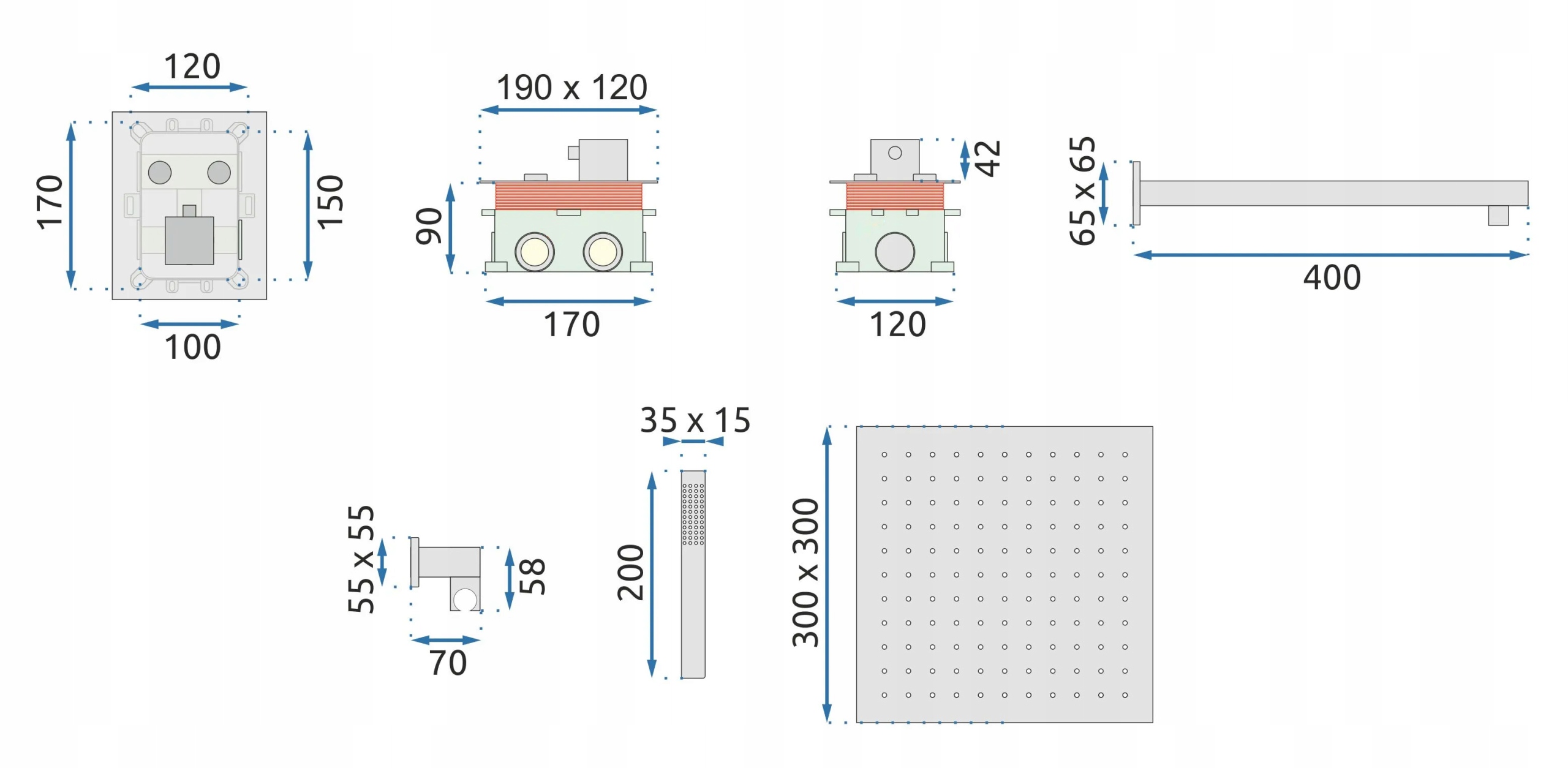 В комплект входит тонкий квадратный тропический душ толщиной 5 мм со стороной 30 см, смеситель с накладными и скрытыми элементами, шланг с трубкой и точечный набор.