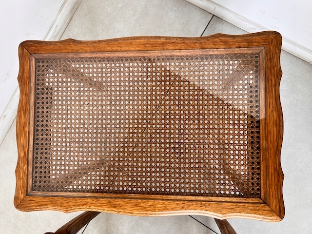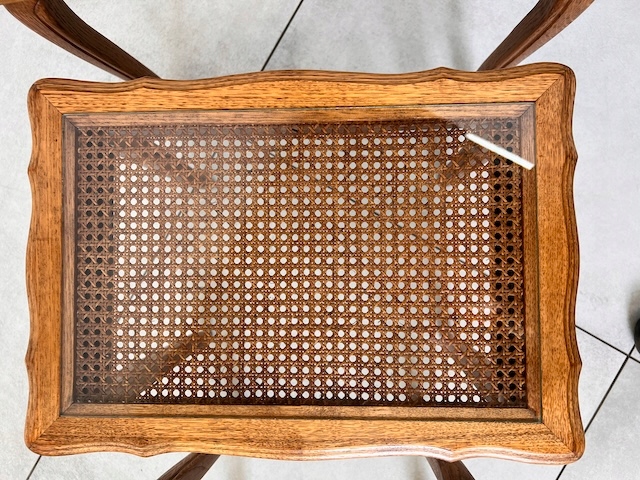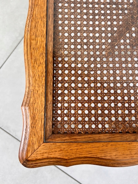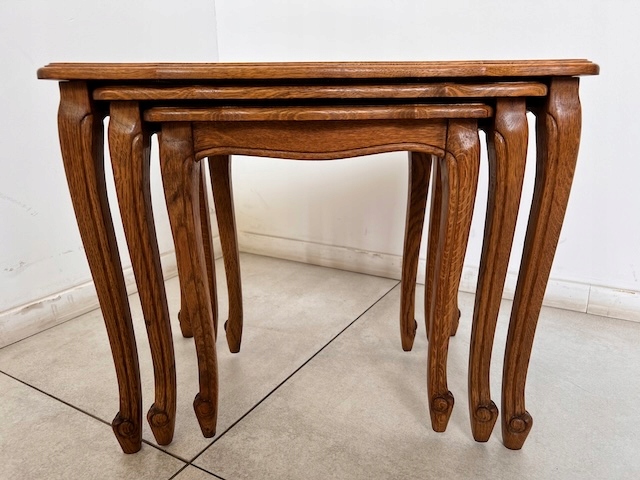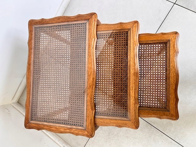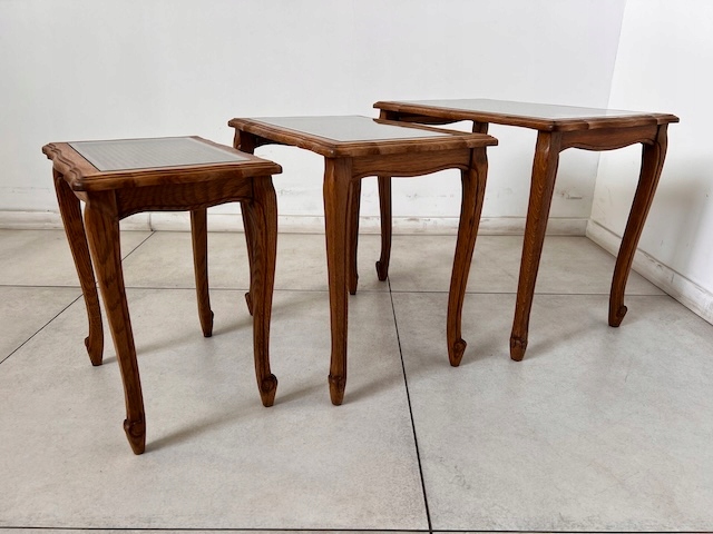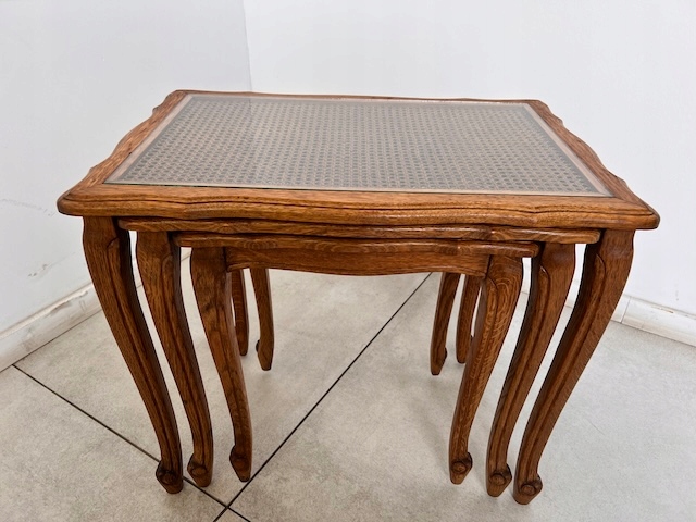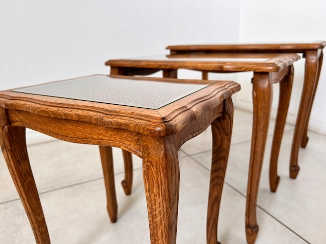 Дубовые тройки выполнены в стиле Людвик. Очень хорошо. Столешница сплетена из рафии и покрыта стеклом. Они в хорошем состоянии. Они не имеют повреждений и дефектов. На них видны типичные следы использования. Столы готовы к установке.