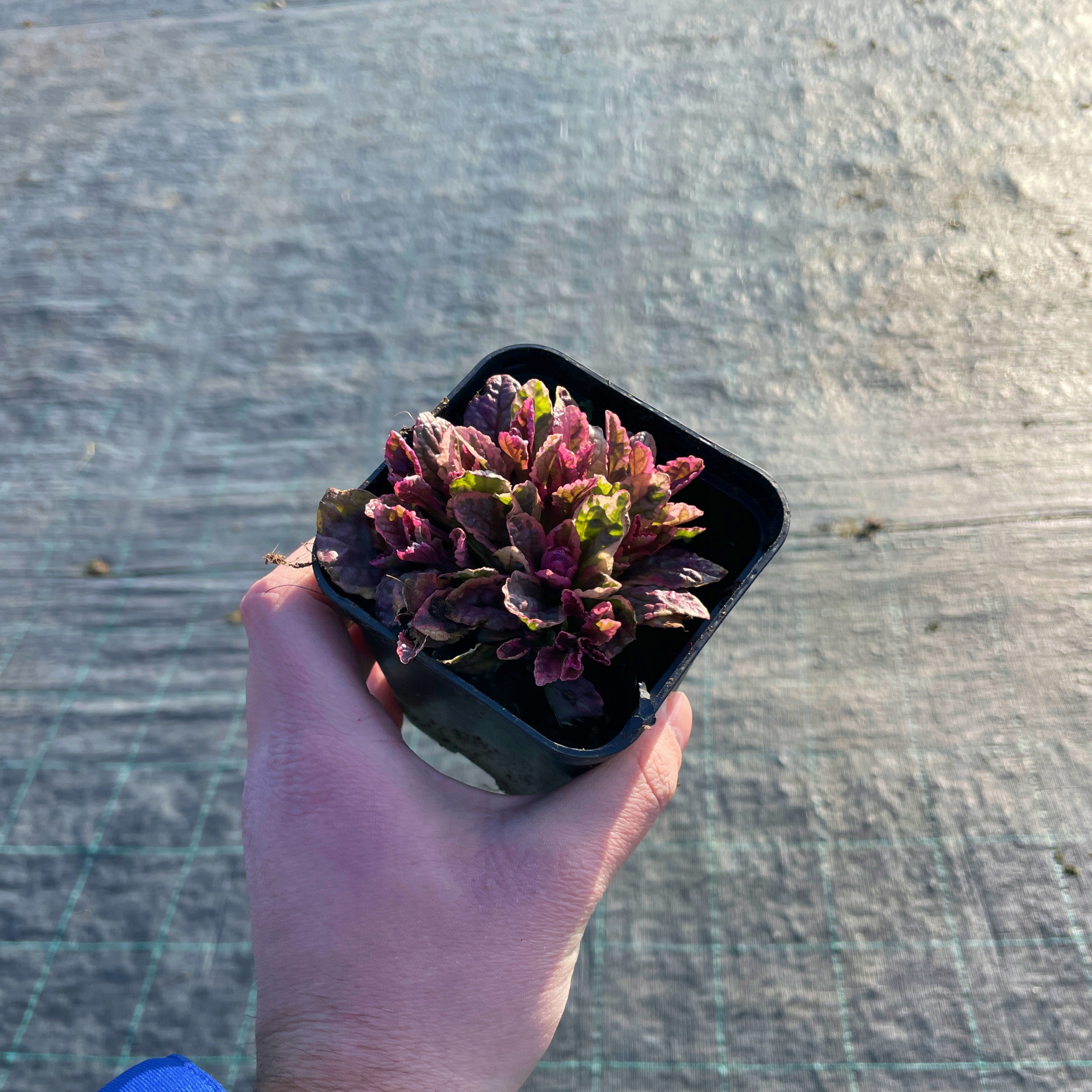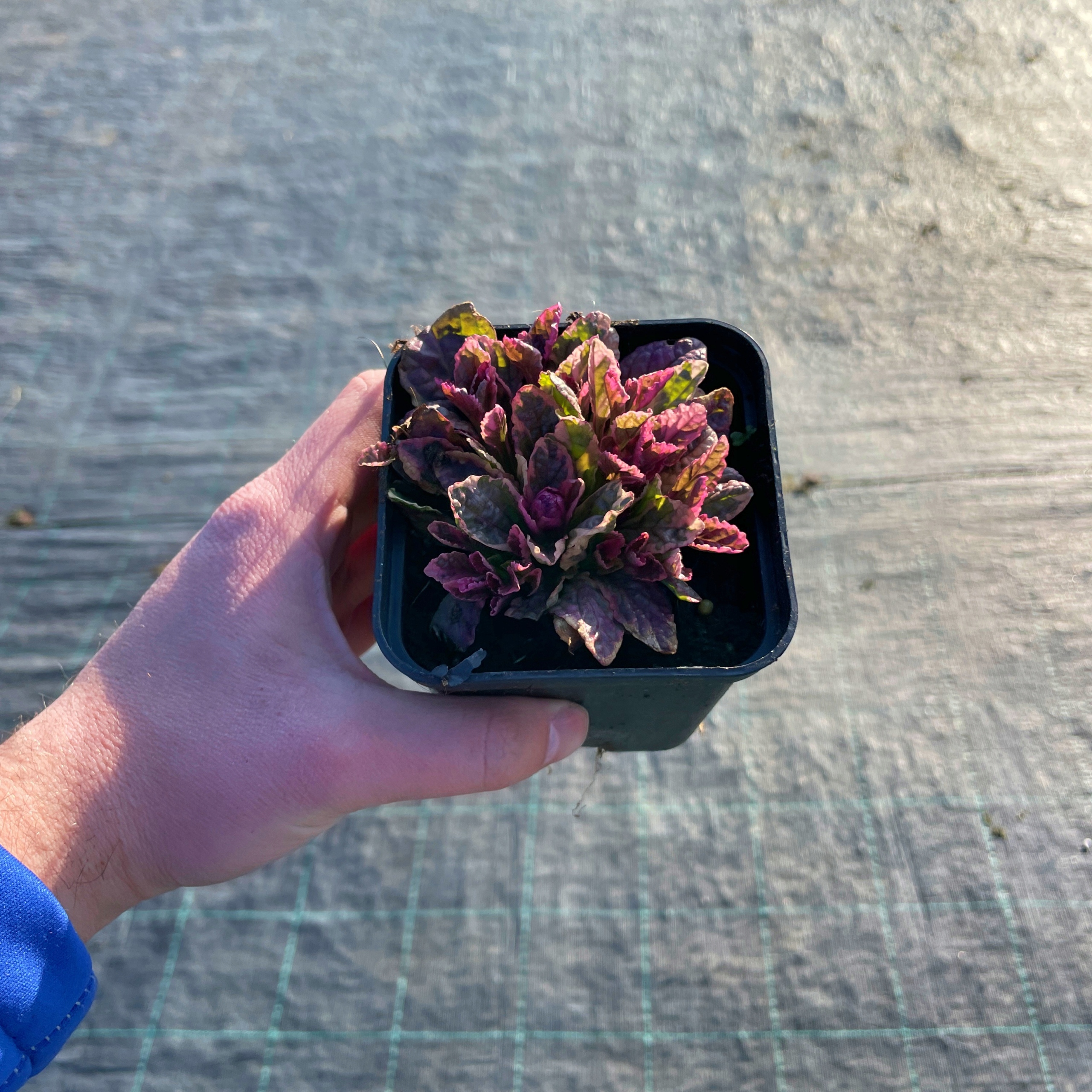 Листовые пластинки обратнояйцевидные, слегка выемчатые, по краям волнистые. Этот сорт отличается выразительной и насыщенной окраской листьев, принимающих оттенки зеленого, розового и фиолетового цвета, разнообразными кремово-белыми неровными пятнами на концах. Осенью листья приобретают яркую окраску.