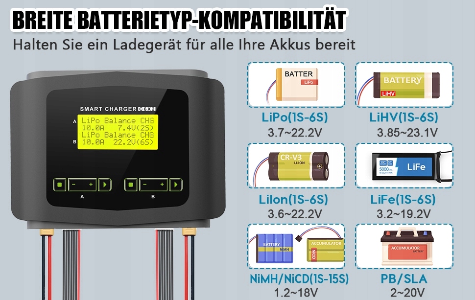 ? Серии различных батарей? 1-6S Lipo Life Lihv Lilon, популярное напряжение 3,7 В, 7,4 В, 11,1 В, 14,8 В, 22,2 В; 1-15S NIEH/NICD, Популярное напряжение 3,6 В, 4,8 В, 6 В, 7,2 В, 9,6 В, 12 В; 2-20V PB и интеллектуальная батарея I / II / III. Автоматическая идентификация количества литиевых батареев. Многие режимы: зарядка, быстрая зарядка, компенсационная зарядка, разгрузка, зарядка за хранение, циклическая зарядка/разгрузка.