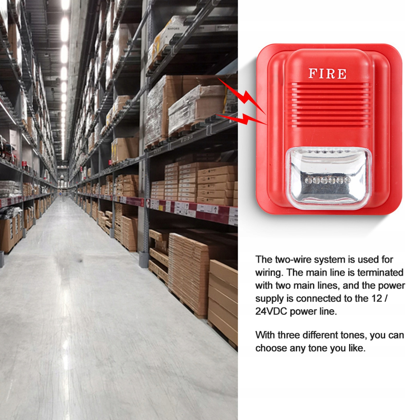 1. Устройство звуковой и световой сигнализации является окончательным устройством сигнализации и предназначено для обработки звуковой и световой сигнализации в случае пожара. 2. Для электропроводки используется двухпроводная система. Основная линия заканчивается двумя основными линиями, а источник питания подключается к линии электропитания 12/24 В постоянного тока. 3. Благодаря трем различным тонам вы можете выбрать любой понравившийся тон. 4. Встроенные 6 светодиодов, сирена издает громкий звук и быстро мигает, напоминая людям о необходимости спастись от огня. 5, удобен в эксплуатации и использовании и имеет большую практическую ценность.