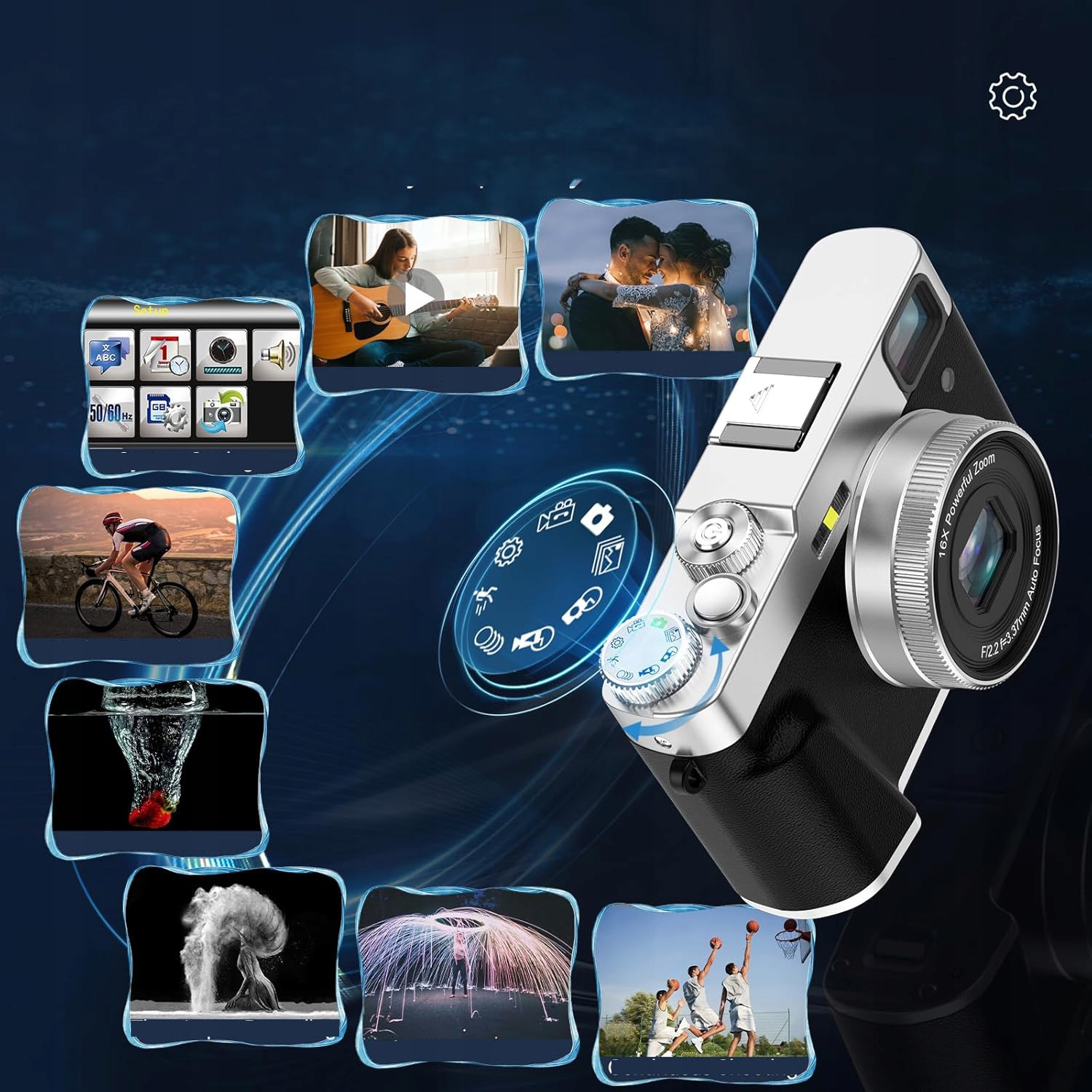 - С помощью диска эту мини-цифровую камеру можно быстро и легко переключить на 8 режимов съемки, которые вы необходимость (фото, видео, системные настройки, обнаружение движения, замедленная съемка, покадровая съемка, непрерывная съемка).