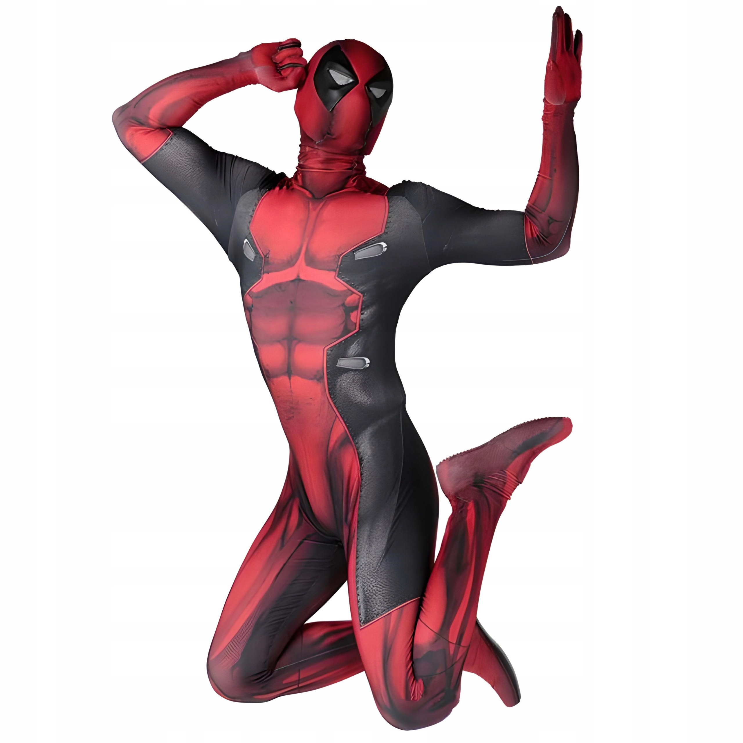 Цельный костюм Дэдпула в черно-красном цвете. Хорошо сшит, слегка эластичен, застегивается на молнию. Благодаря нашему предложению каждый превратится в любимого персонажа комиксов.