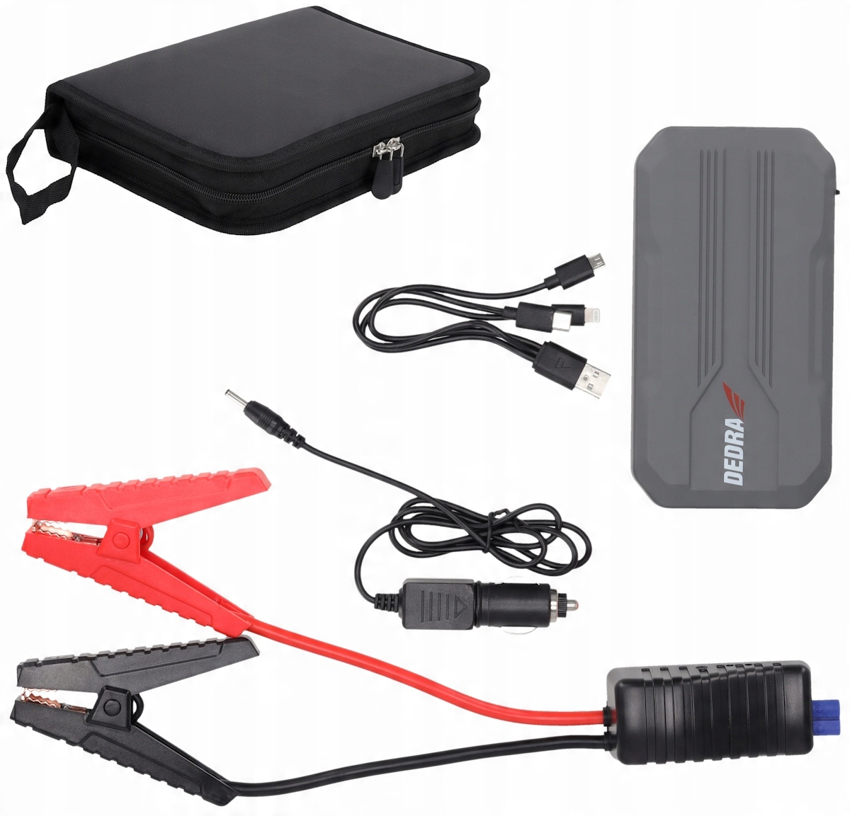 Пусковое устройство DEDRA с функцией Powerbank, емкость аккумулятора 12000 мАч. В комплект входят соединительные кабели и USB-кабель — USB-C, MicroUSB, Lightning