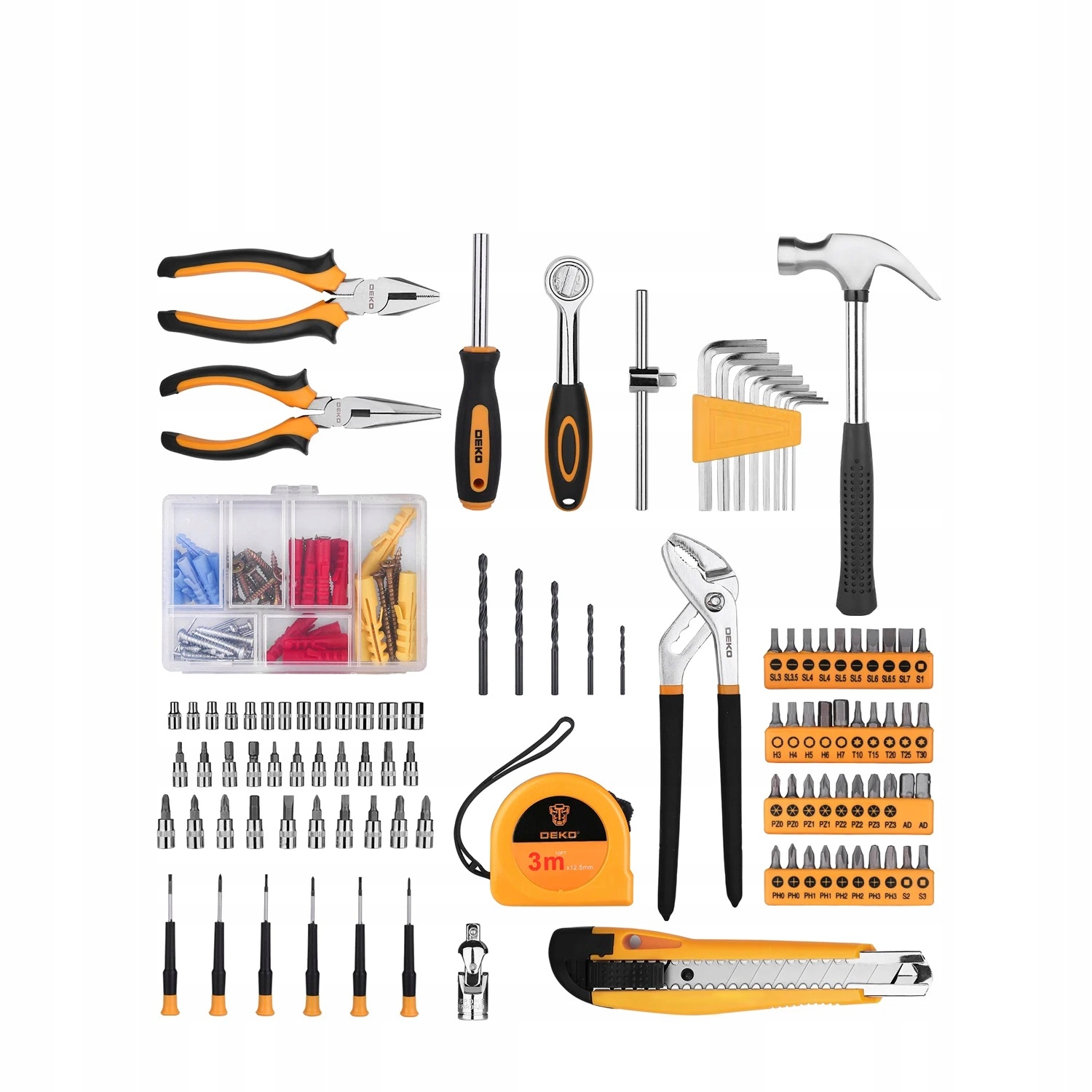 Набор инструментов DEKO , модель DKMT168 — это универсальный набор, содержащий 168 деталей, который идеально подходит для домашнего использования, в мастерской или гараже. Они прекрасно подходят для различных ремонтных и домашних работ. Инструменты из прочной стали гарантируют комфортную работу. В набор входят разнообразные отвертки, плоскогубцы, молоток, гаечные ключи, торцевые головки, ручная пила, уровень и эффективный ключ-трещотка с 72 зубцами. Все поставляется в удобном кейсе, облегчающем организацию. , хранение и транспортировка инструментов.