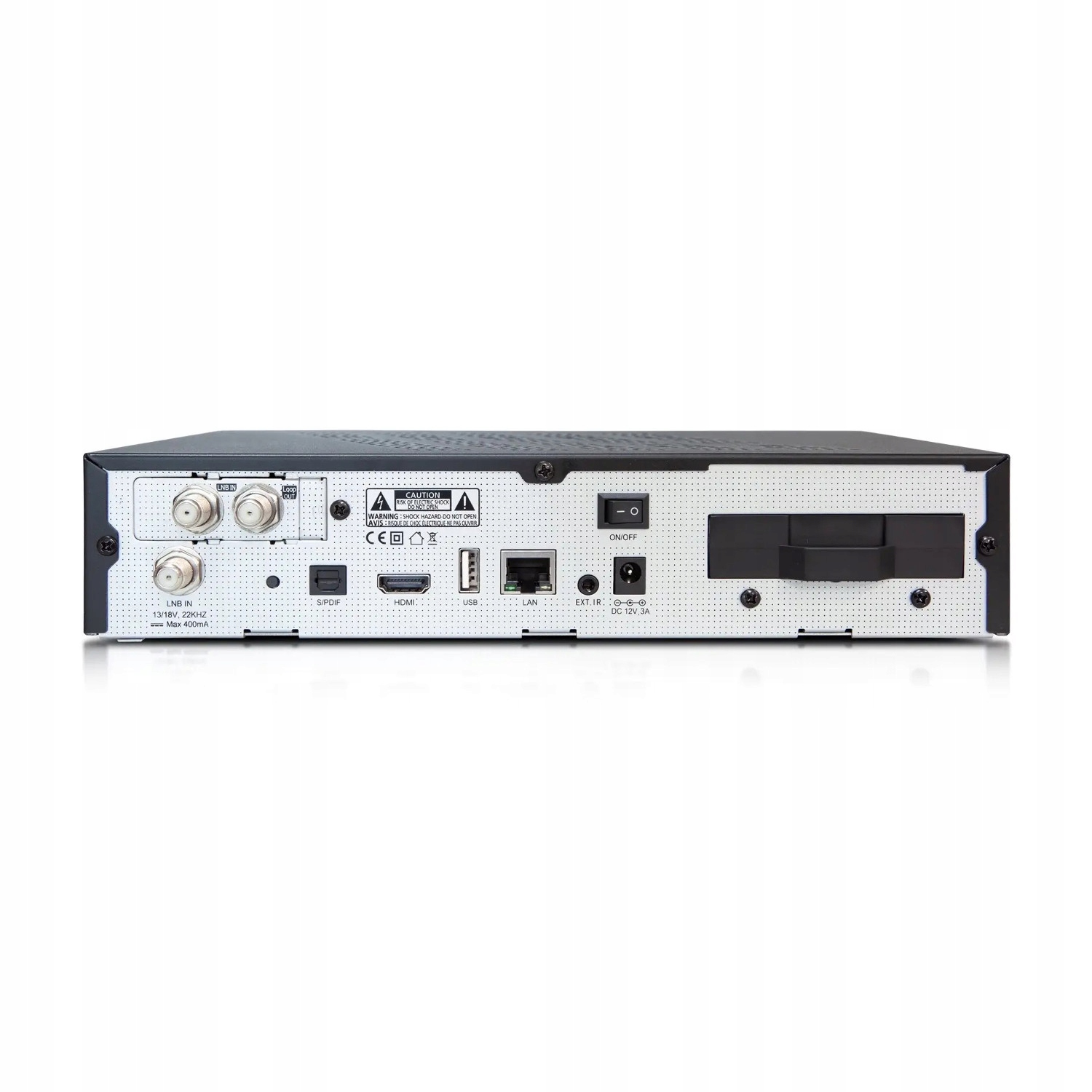 Элегантный дизайн ресивера подойдет для любой гостиной. На передней панели расположен 7-сегментный светодиодный дисплей. За дверцей вы найдете 1 кардридер, 2 слота для модуля CI, 1 слот USB 2.0 и 1 слот для карт microSD, которые вы можете использовать в качестве внутренней памяти для своих записей. На задней панели расположен встроенный спутниковый тюнер DVB-S2X и второй спутниковый тюнер Plug & Play DVB-S2X.