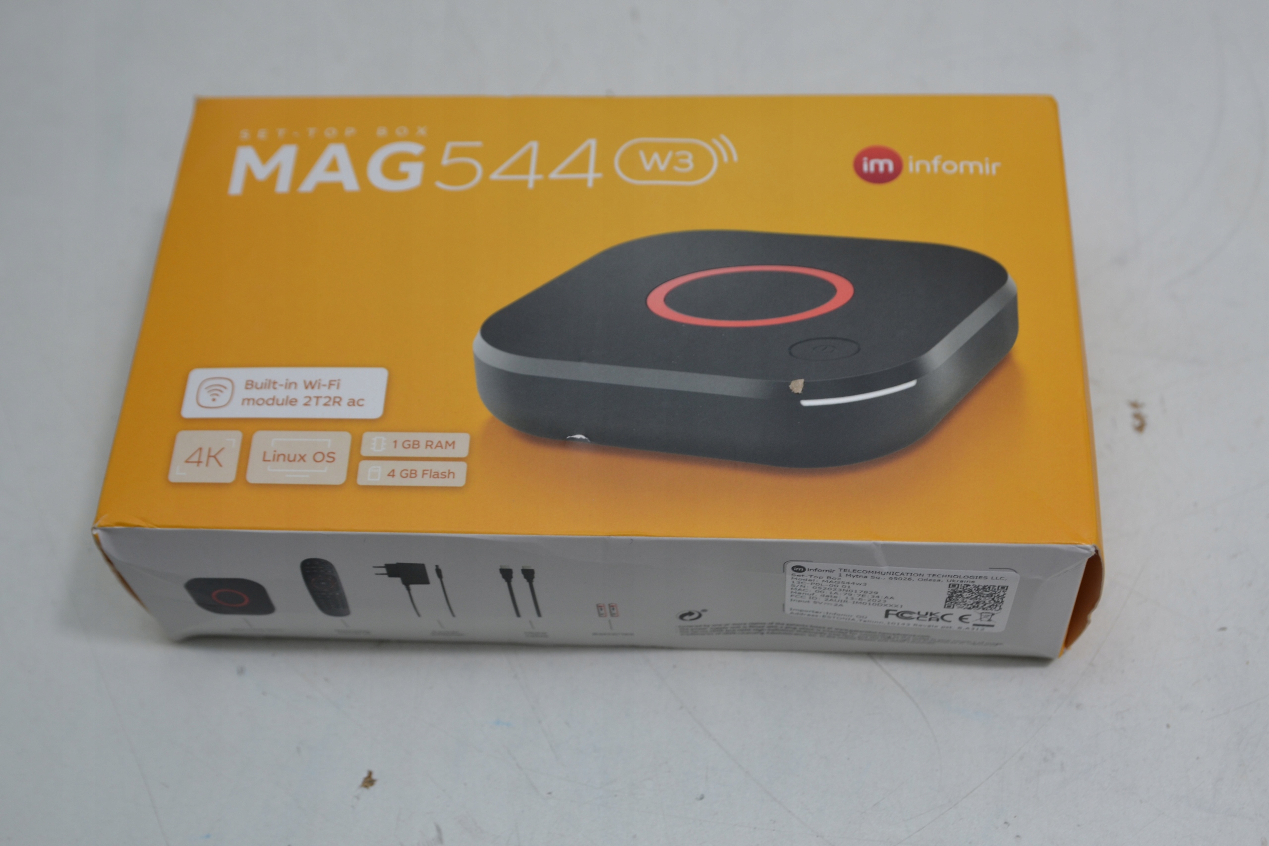 Infomir MAG544 — IPTV-приставка на базе Linux версии 4.9. Он оснащен эффективным четырехъядерным процессором ARM Cortex-A35 с тактовой частотой 2 ГГц и 1 ГБ оперативной памяти. Он обеспечивает очень высокую производительность и может легко обрабатывать видеоконтент 4K со скоростью 60 кадров в секунду. Устройство оснащено разъемом HDMI 2.1, двумя портами USB 2.0 и портом Fast Ethernet.