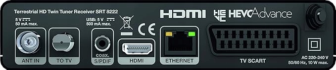 Разъемы и соединения: Декодер STRONG SRT8222 предлагает широкий выбор разъемов, таких как ANT IN, TO TV, коаксиальный S/PDIF, HDMI, RJ-45 Ethernet, TV SCART и порт USB. Это обеспечивает совместимость с большинством современных и старых устройств.