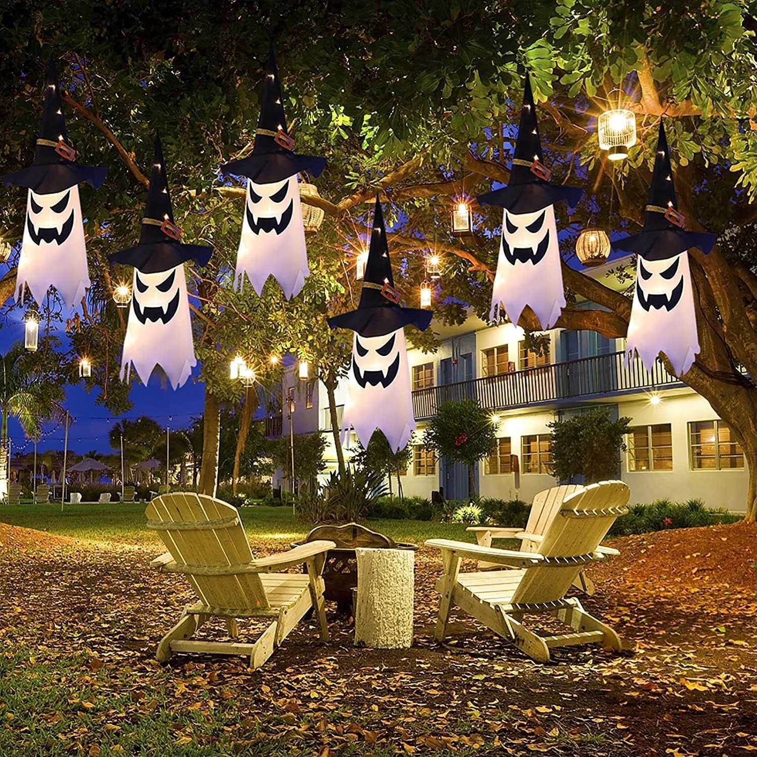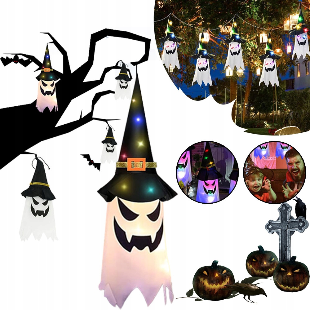 УКРАШЕНИЯ НА ХЭЛЛОУИН, ПОДВЕСНЫЕ СВЕТЯЩИЕСЯ ПРИЗРАКИ В ШЛЯПЕ, СВЕТЯЩИЙСЯ ДУХ 5 ШТ.