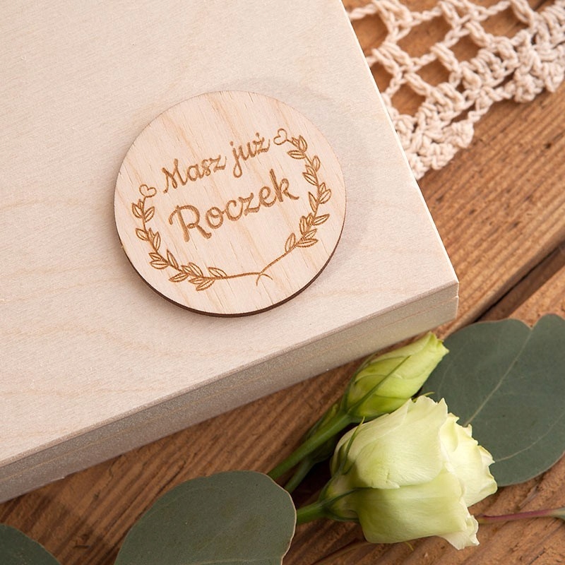 Красивое деревянное украшение из натурального дерева, предназначенное для крышки сундука или подарочной коробки на день рождения ребенка. Украшение имеет изящную гравировку веточек и надпись: Вам уже год. Это прекрасный способ дополнить подарок и очаровать малыша.