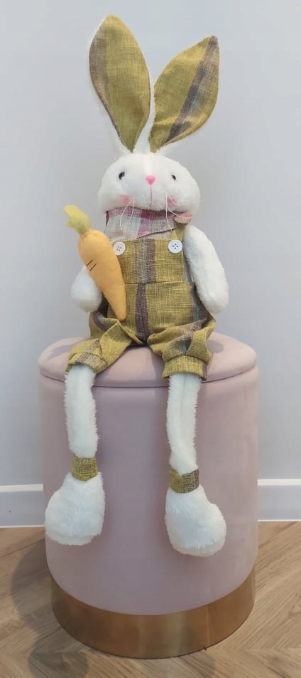 У зайчика костюмчик из джутовой ткани, подвижные уши и висячие ножки, на которых его можно усадить. шкаф или консоль.