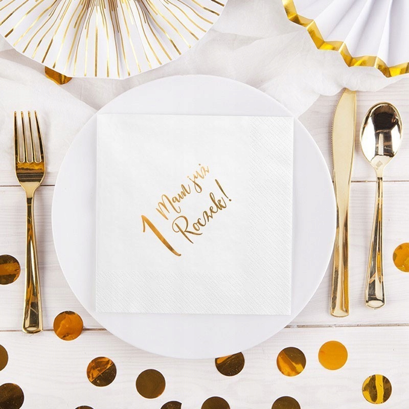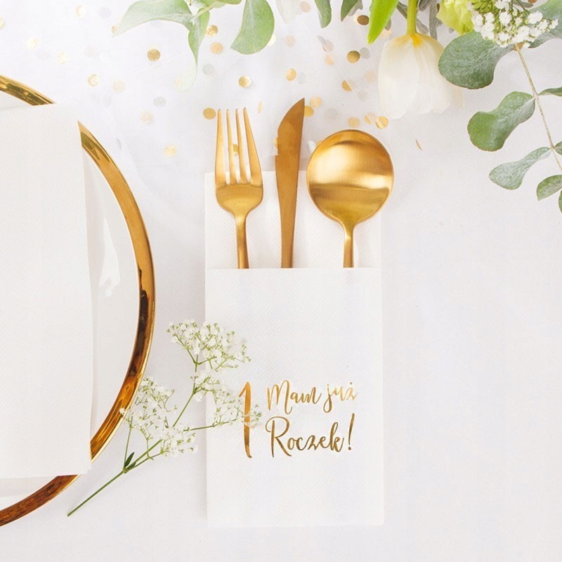 Сложные карманы столовых приборов в белом с золотой блестящей надписью мне уже один год, 33x33с - 20 ПК