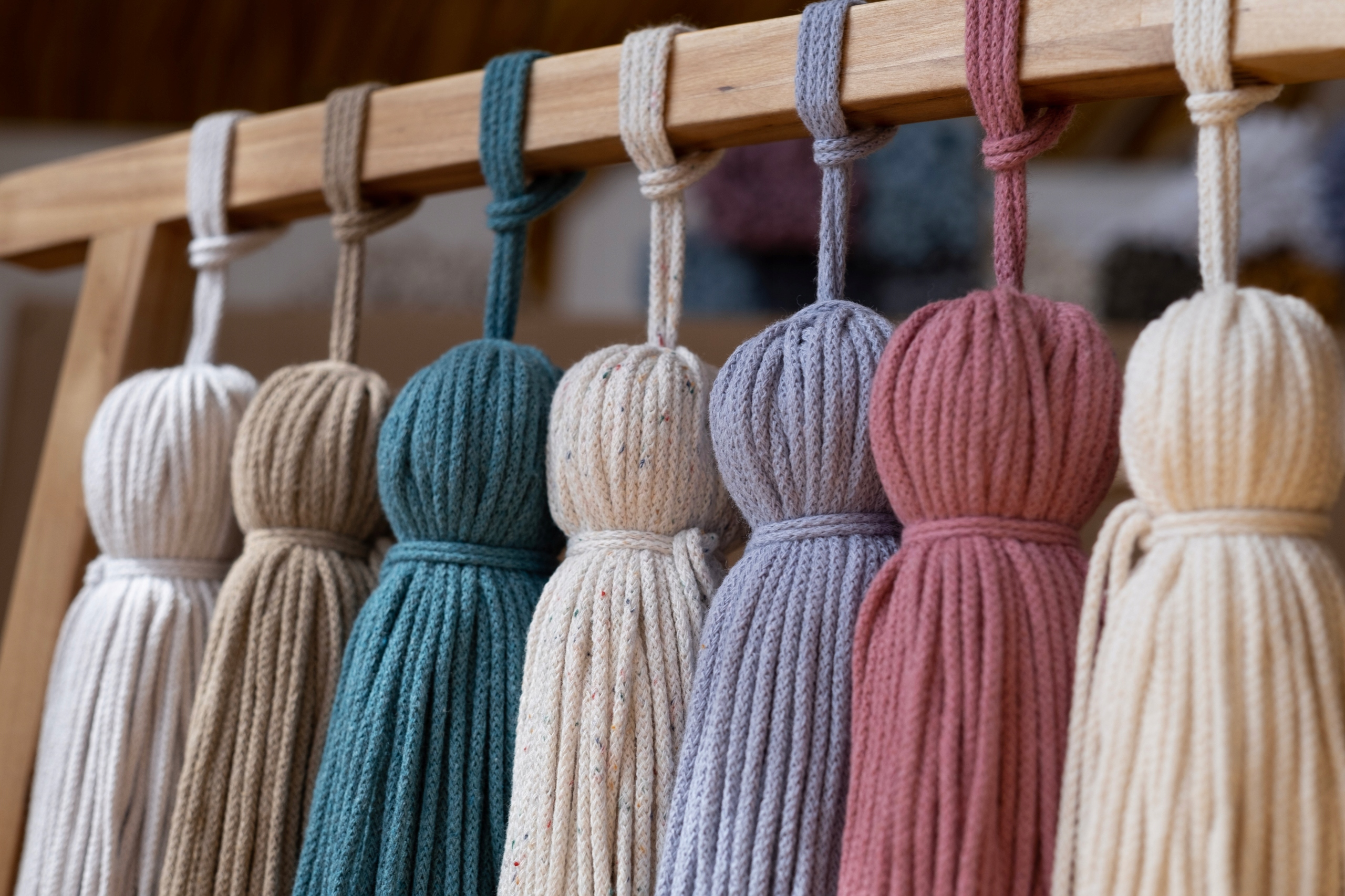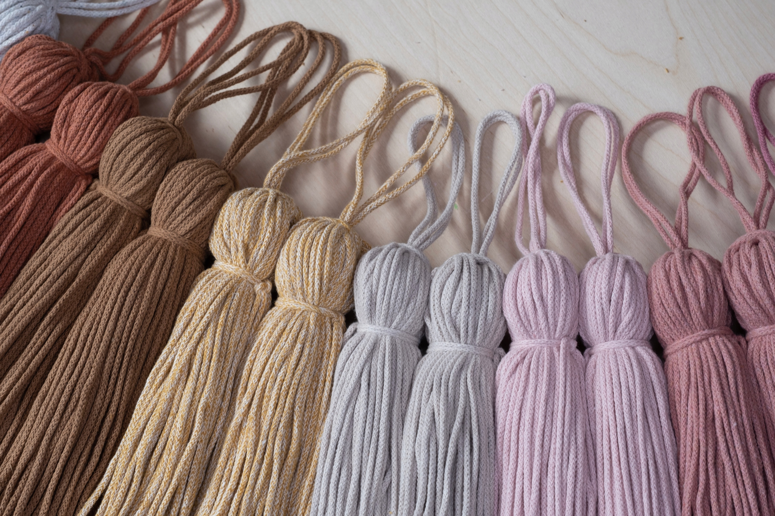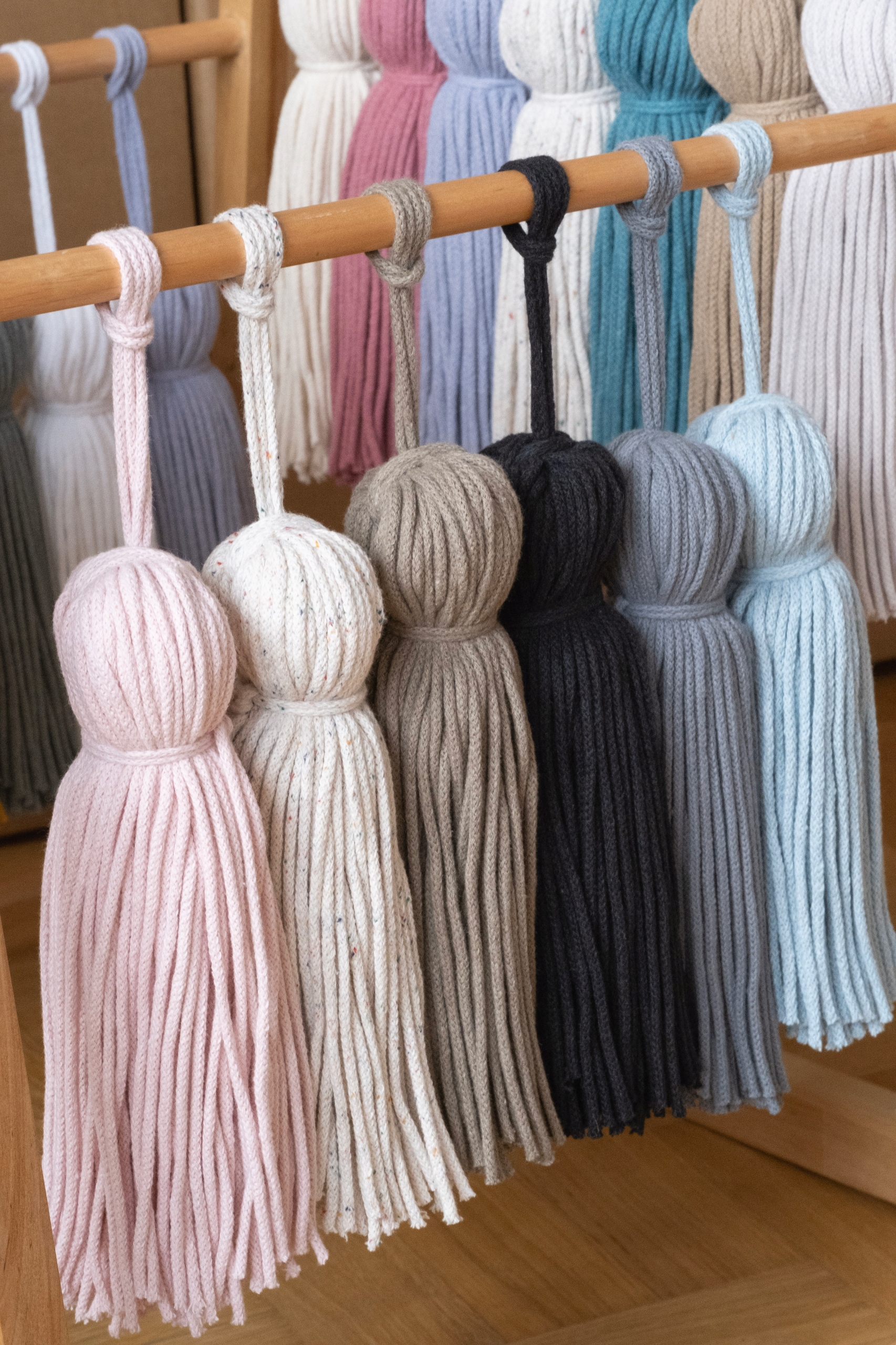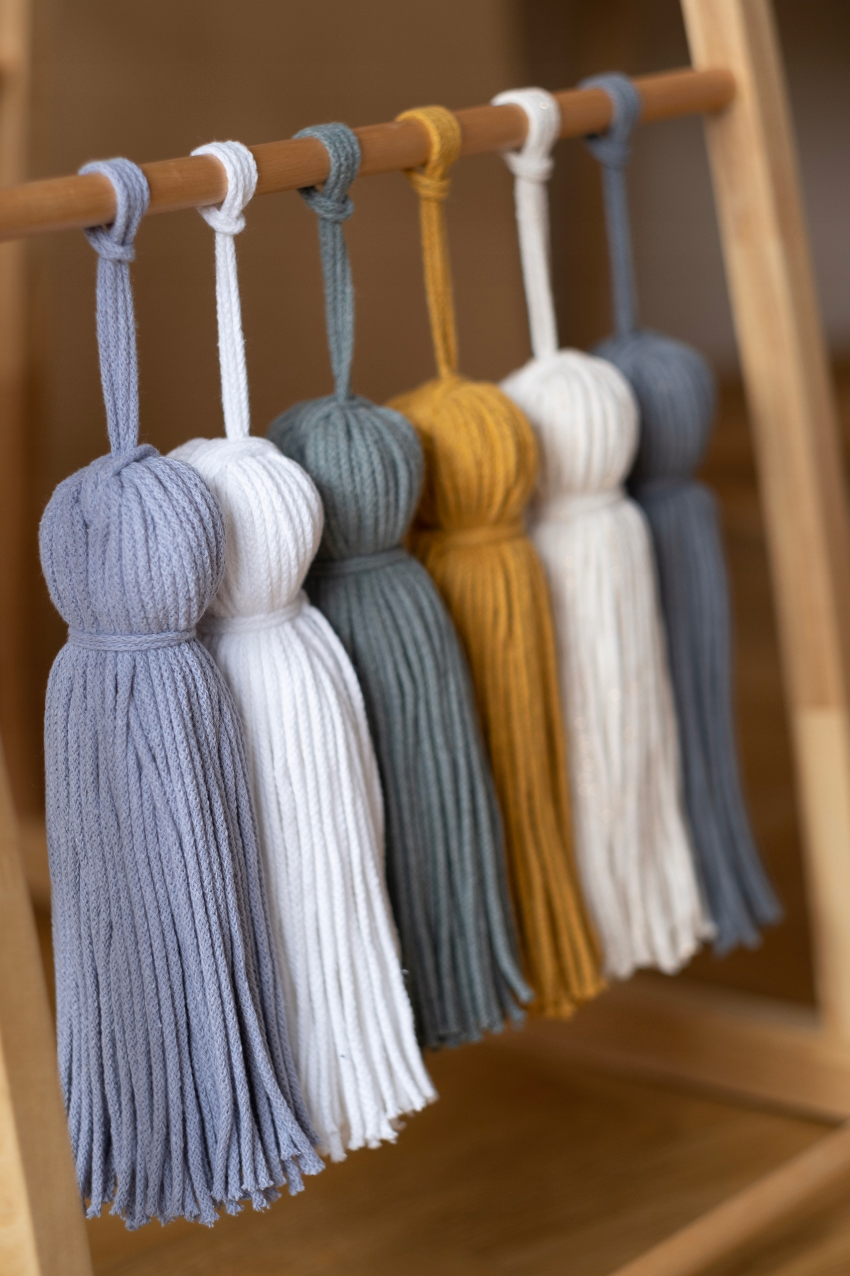 Декоративная кисточка/кисточка, изготовленная вручную из хлопковой нити. Материал сертифицирован как безопасный для маленьких детей, в процессе изготовления не используются вредные вещества, сертификат OekoTex Standard 100.