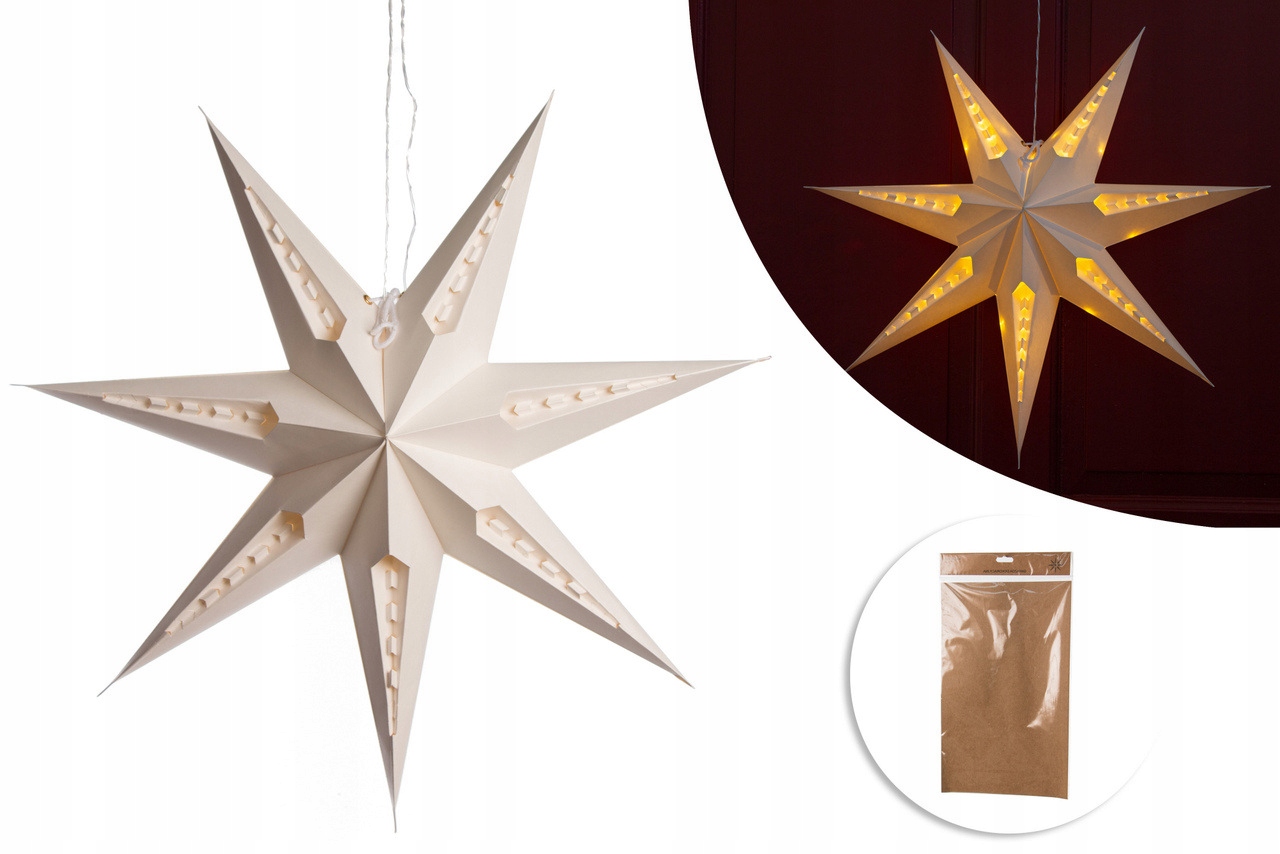 Висячая звезда из высококачественной бумаги кремового цвета (кремового цвета) со светодиодной подсветкой. Украшение работает от 3-х батареек-стиков (батарейки в комплект не входят). Изделие эстетично выполнено, что делает его уникальным украшением. Позволяет создать уютную атмосферу в помещении.