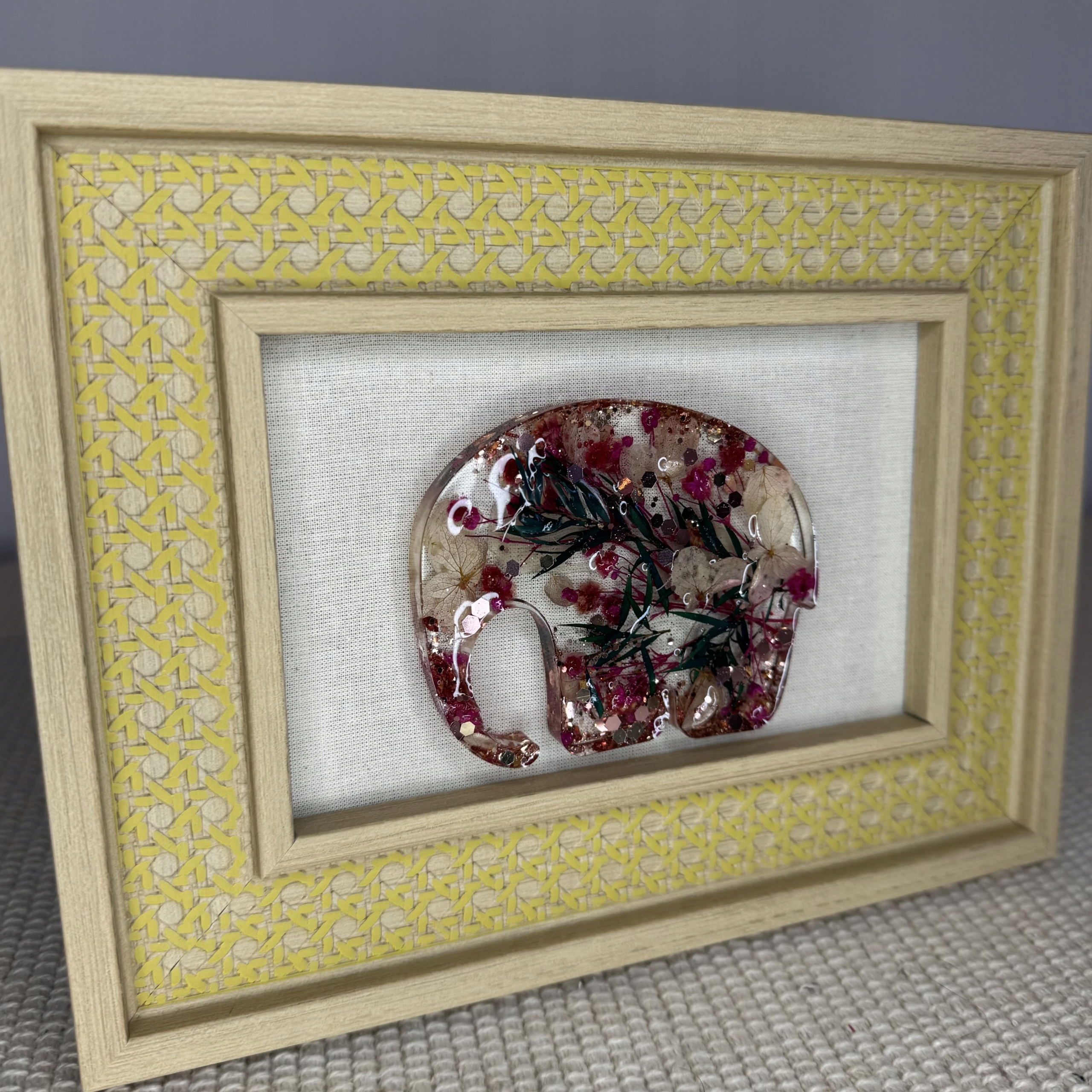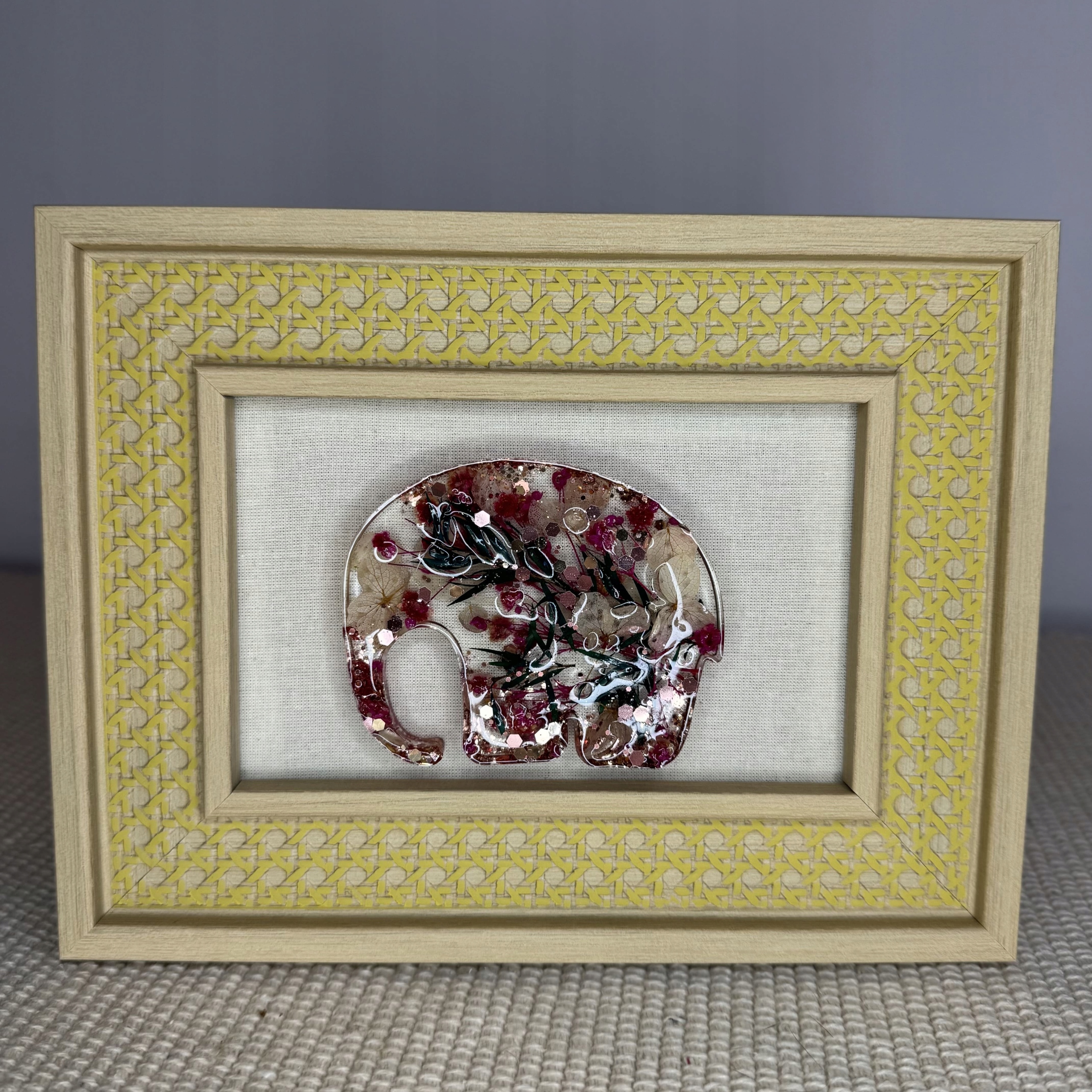 Элегантная декоративная картина с мотивом слона, выполненная вручную с вниманием к деталям. Центральным элементом является художественный силуэт слона, выполненный из смолы, со встроенными натуральными декоративными элементами, что делает каждое изделие уникальным.
