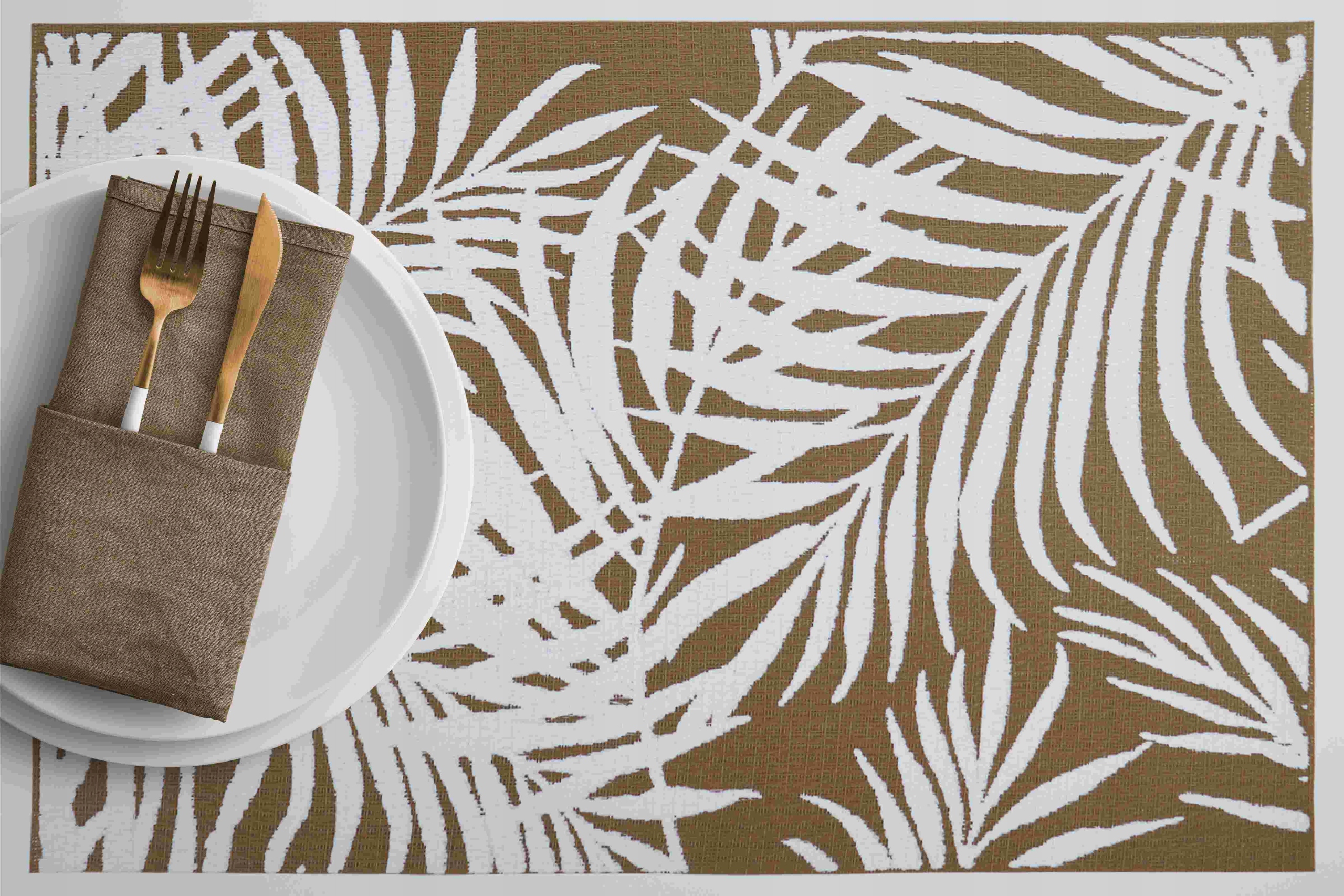 Введите тропический акцент в столовую с помощью натуральной падки Palms с размерами 45x30 см. Бежевый фон с мотивом белого пальмового листа дает внутреннюю легкость и современный характер. Мат идеально защищает поверхность стола от грязи, выполняя декоративную функцию. Идеально подходит для повседневного использования и во время встреч за столом.