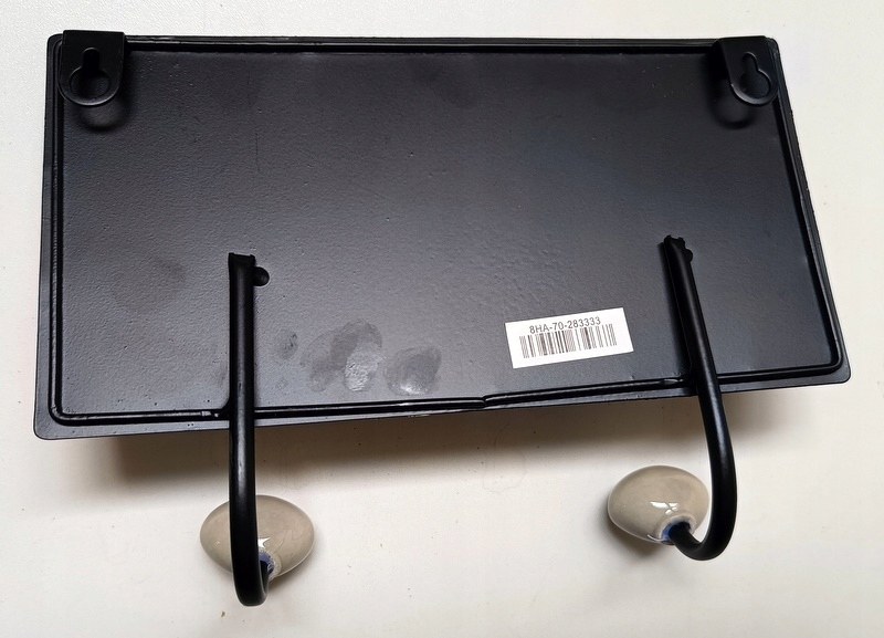 Предмет аукциона – металлическая вешалка для одежды. Идеально подходит в качестве украшения, например. для мастерской, гардеробной, клуба или зала. Имеет два крючка, заканчивающихся керамическим шариком. Крепление двумя винтами.