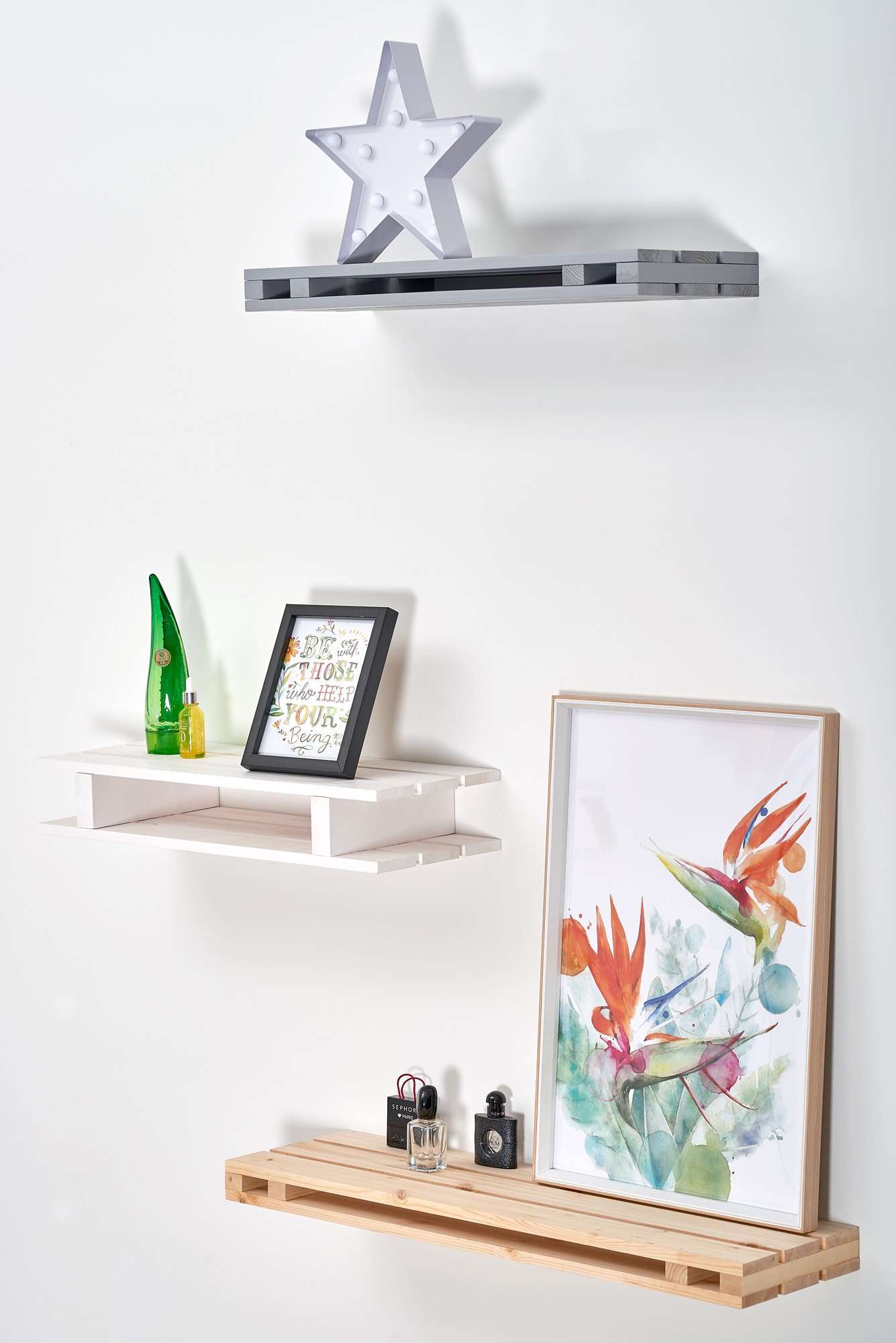 декоративная, деревянная полка, висящая с мотивом палитры. от традиционных полков отличается современным дизайном. Вдумчивый дизайн гарантирует, что декоративная полка является эргономичным решением, потому что он занимает мало места, и все же это очень просторно. Вы можете положить на него фоторамы, цветок, тростники и подсвечники. Все было сделано из высококачественной сосны -древесины .