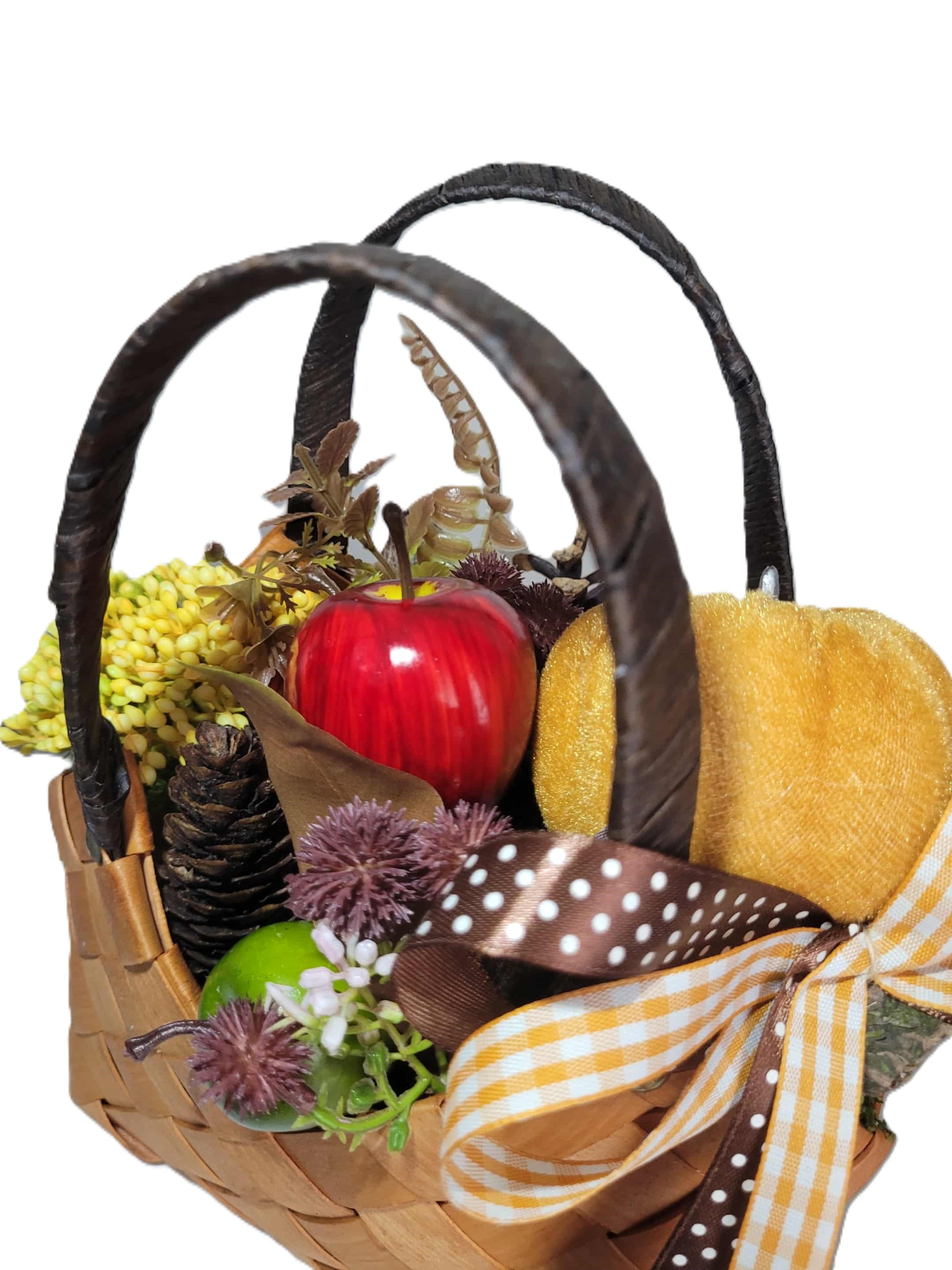 Декоративная корзина ручной работы в натуральном деревенском стиле – идеальное украшение для вашего дома! Наполненный искусственными фруктами, сосновыми шишками, цветами и ветками, он создает теплую, уютную атмосферу - идеально подходит для осени, праздников или в качестве круглогодичного украшения.