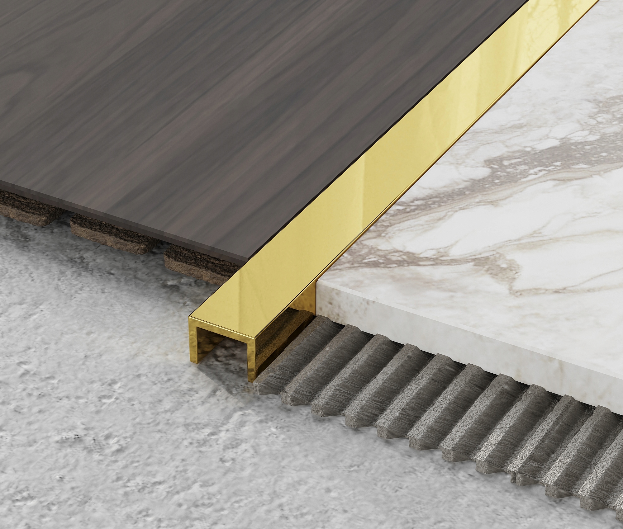 EVISO FLOOR LINE Латунные напольные профили изготавливаются из латуни высочайшего качества, что позволяет им быть установлен на полу. Они прекрасно сочетаются с керамической плиткой, деревом, камнем и панелями. Стильные профили разнообразят внешний вид любого пола. Блестящий элемент на полу сделает вашу комнату уникальной.