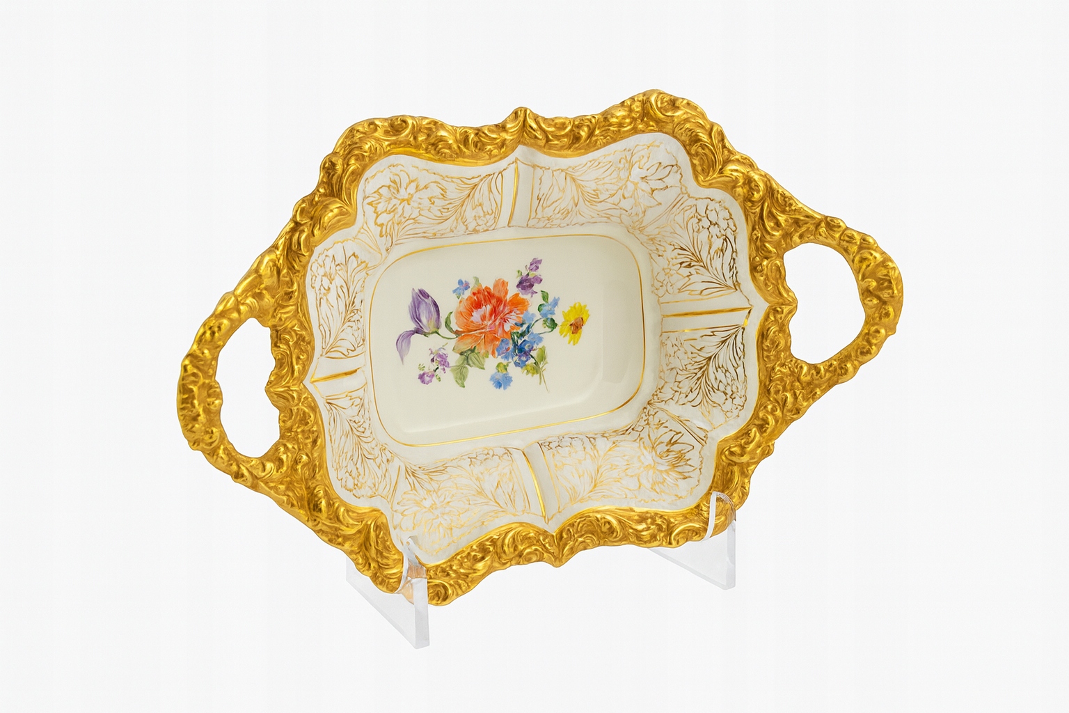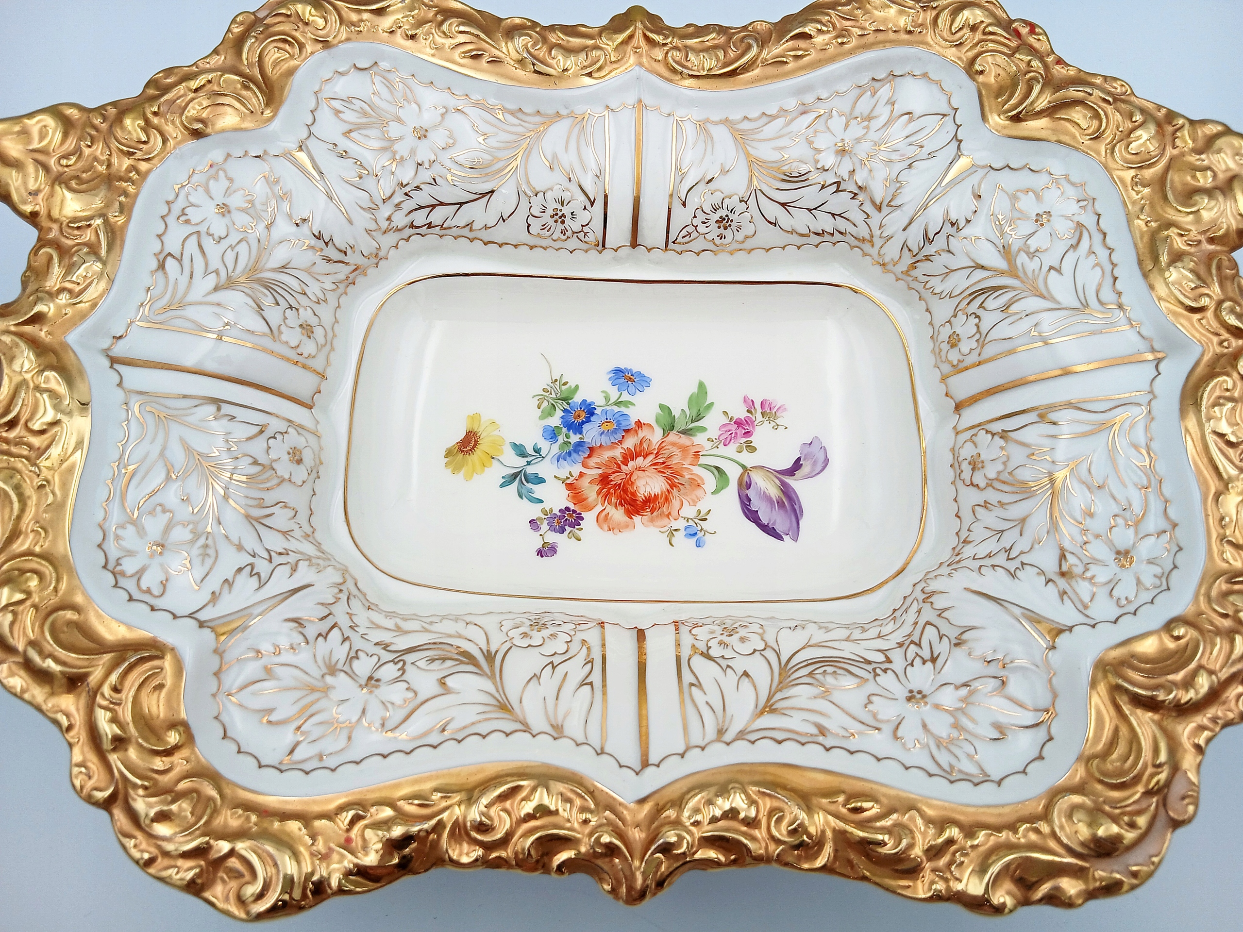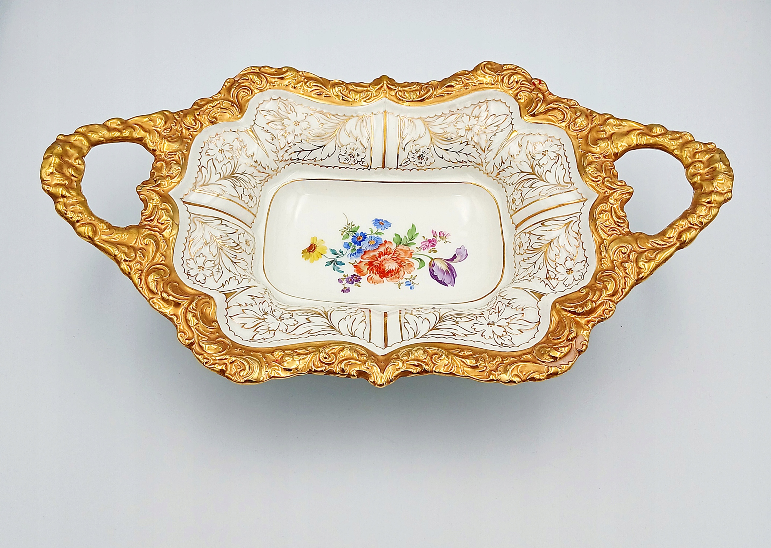 - Украшение: букет цветов насыщенных цветов (красный, пурпурный, синий, зеленый), расписанный вручную. По всему краю сосуда богато украшенная рельефная позолота.