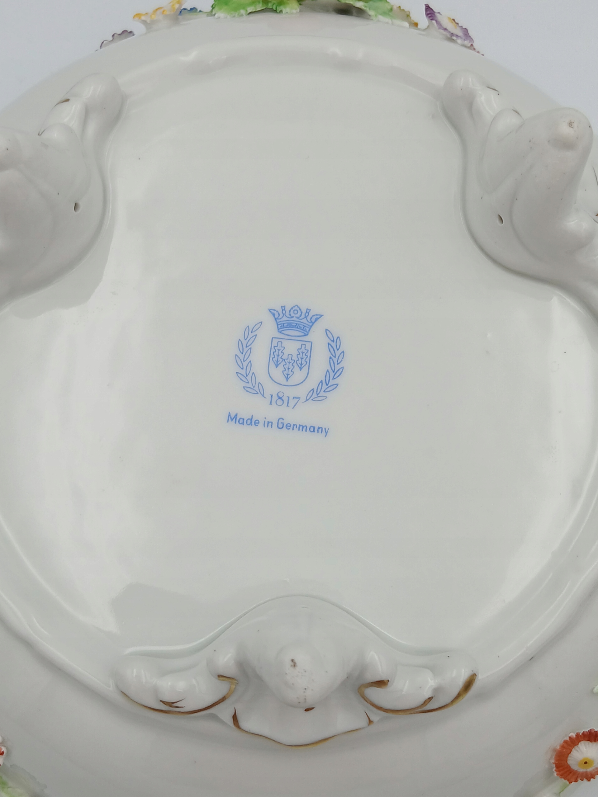 bowl подписано с знаком Dresden, 1817 - Сделано в Германии . Богато украшенные, с элементами моделированных и ручных цветов, характерно для стиля Дрездена, вдохновленного фарфором miśnieńska .