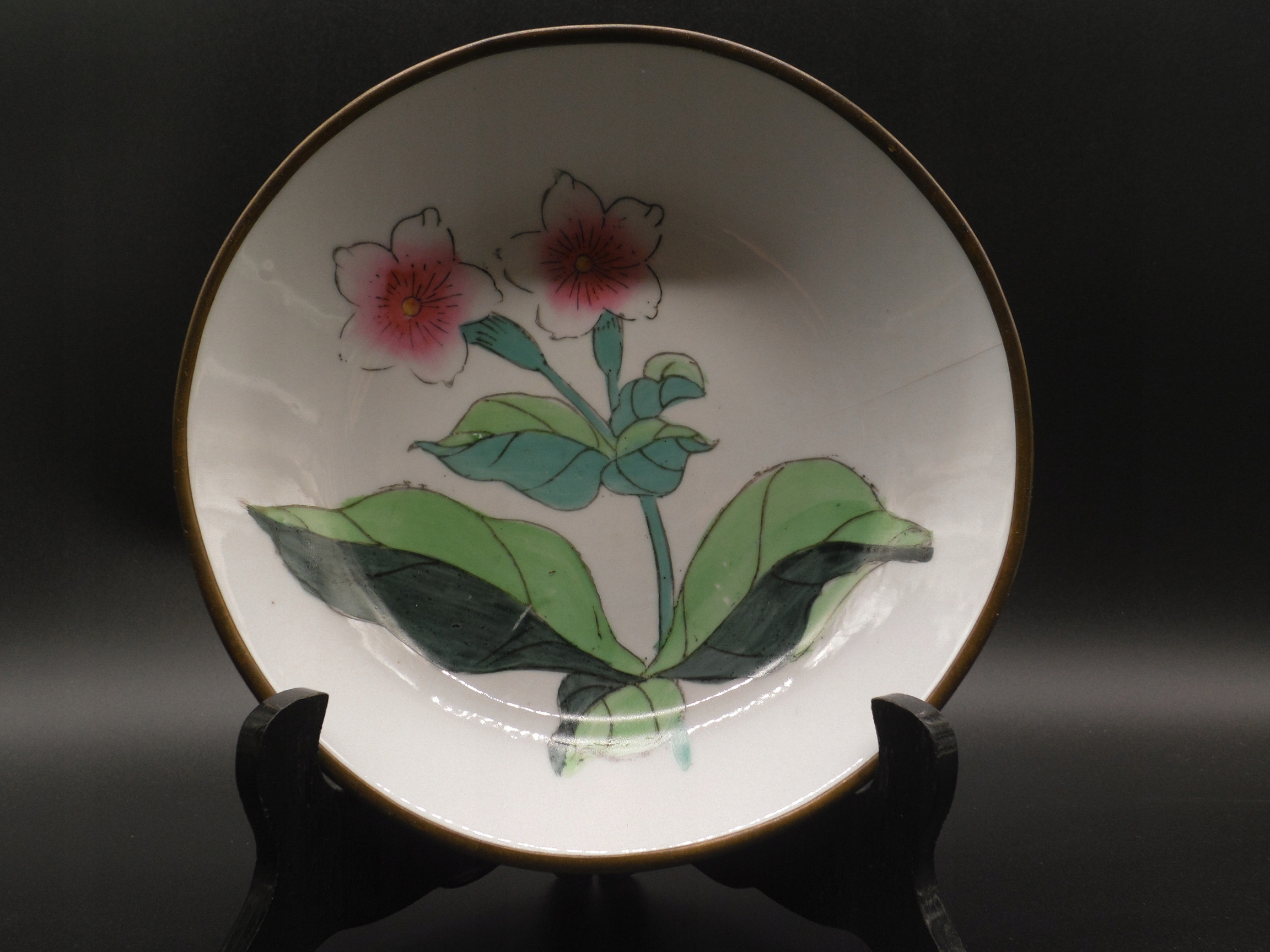 Декоративная фарфоровая миска в латунном крышке, украшенном цветами