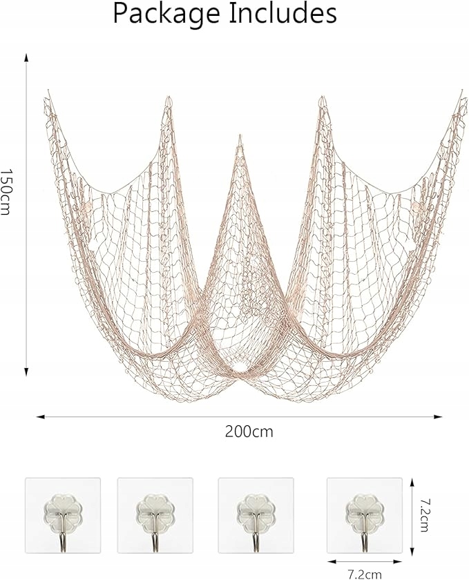 - Легко повесить: сетка оснащена 4 прозрачными, самостоятельными крючками. Вы можете удобно и легко повесить рыболовную сетку на стене и отрегулировать его местоположение и внешний вид. Крюки могут быть застряли к стене, даже если на них висела декоративная сетка.