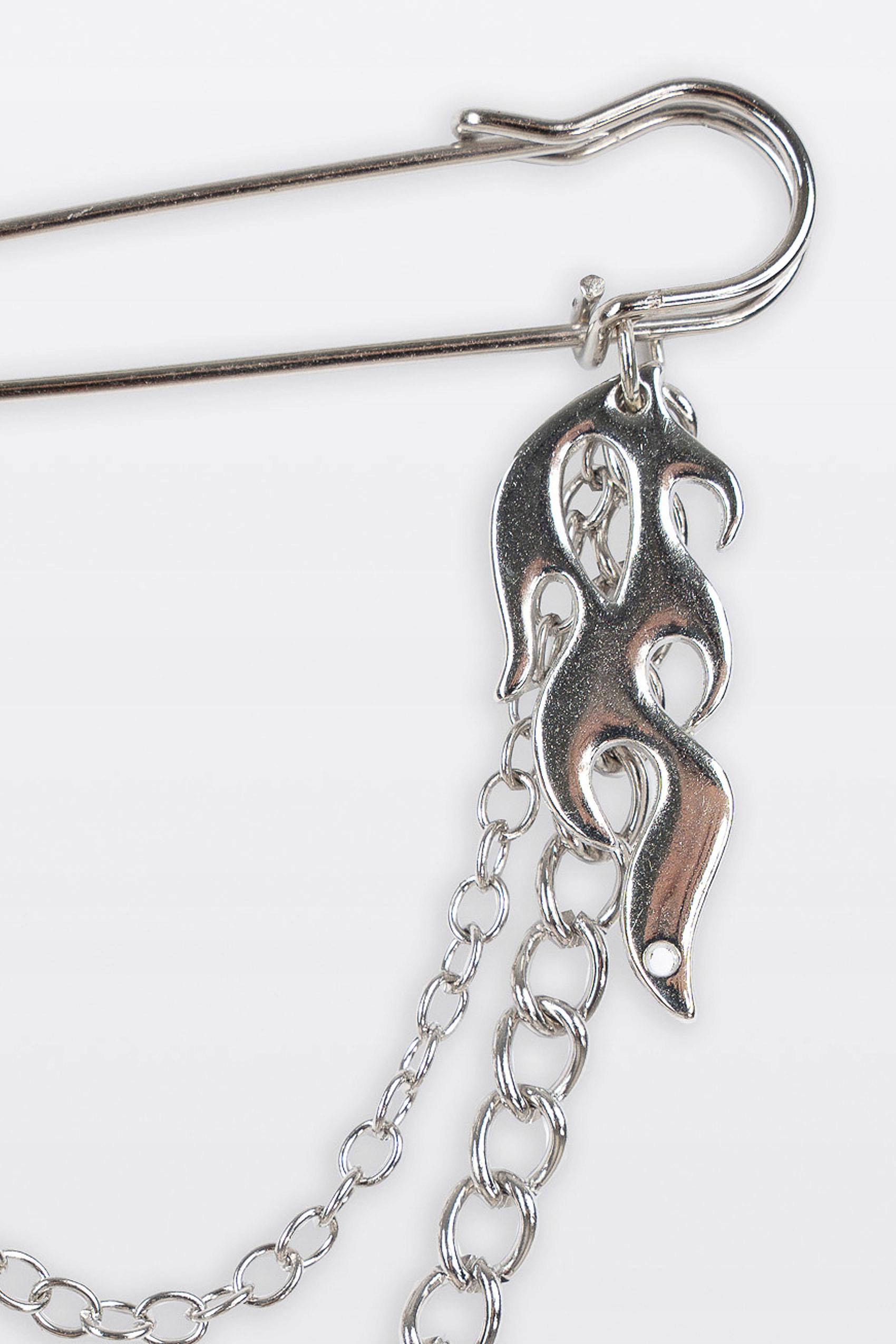 ⭐ Стильный декоративный штифт в серебристо -серебристом b> - это уникальное дополнение, которое даст характер любой стилизации. Благодаря оригинальному пламенному мотиву и декоративным цепям, он отлично подходит как для повседневной, так и для уличной одежды.