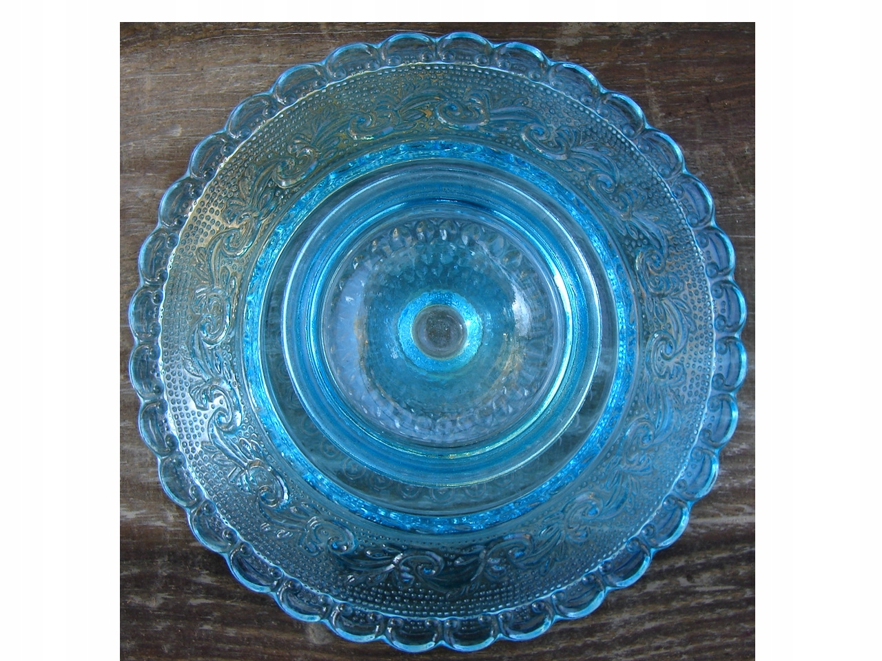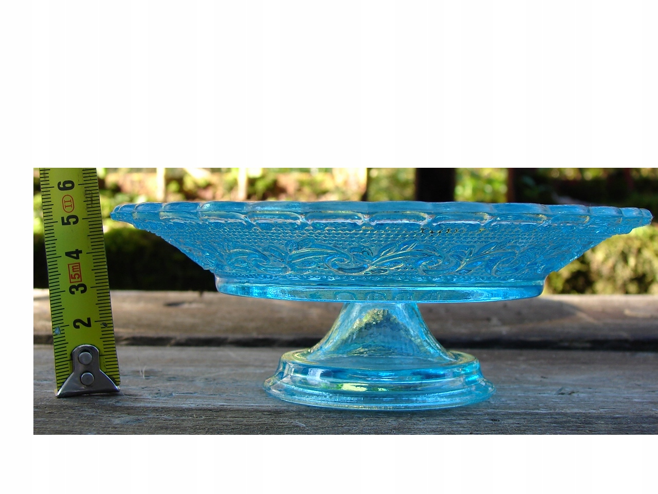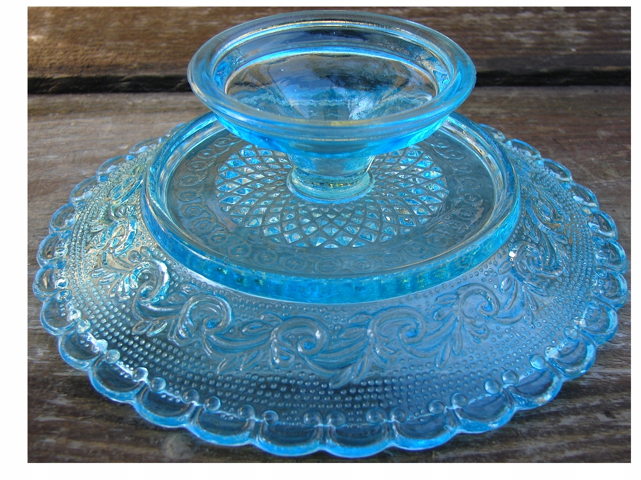 Старая маленькая тарелка на ножке, украшенная выпуклым орнаментом.