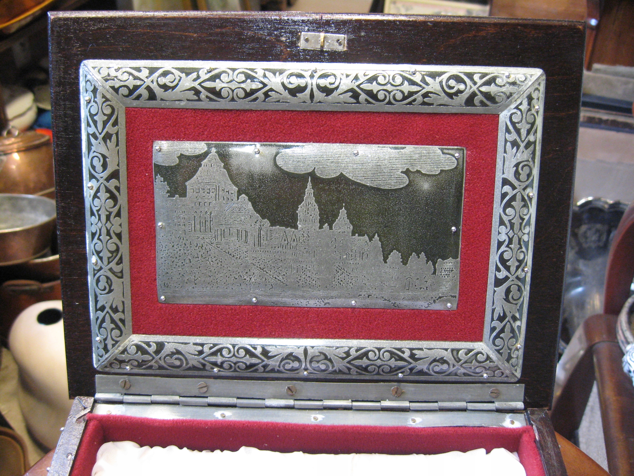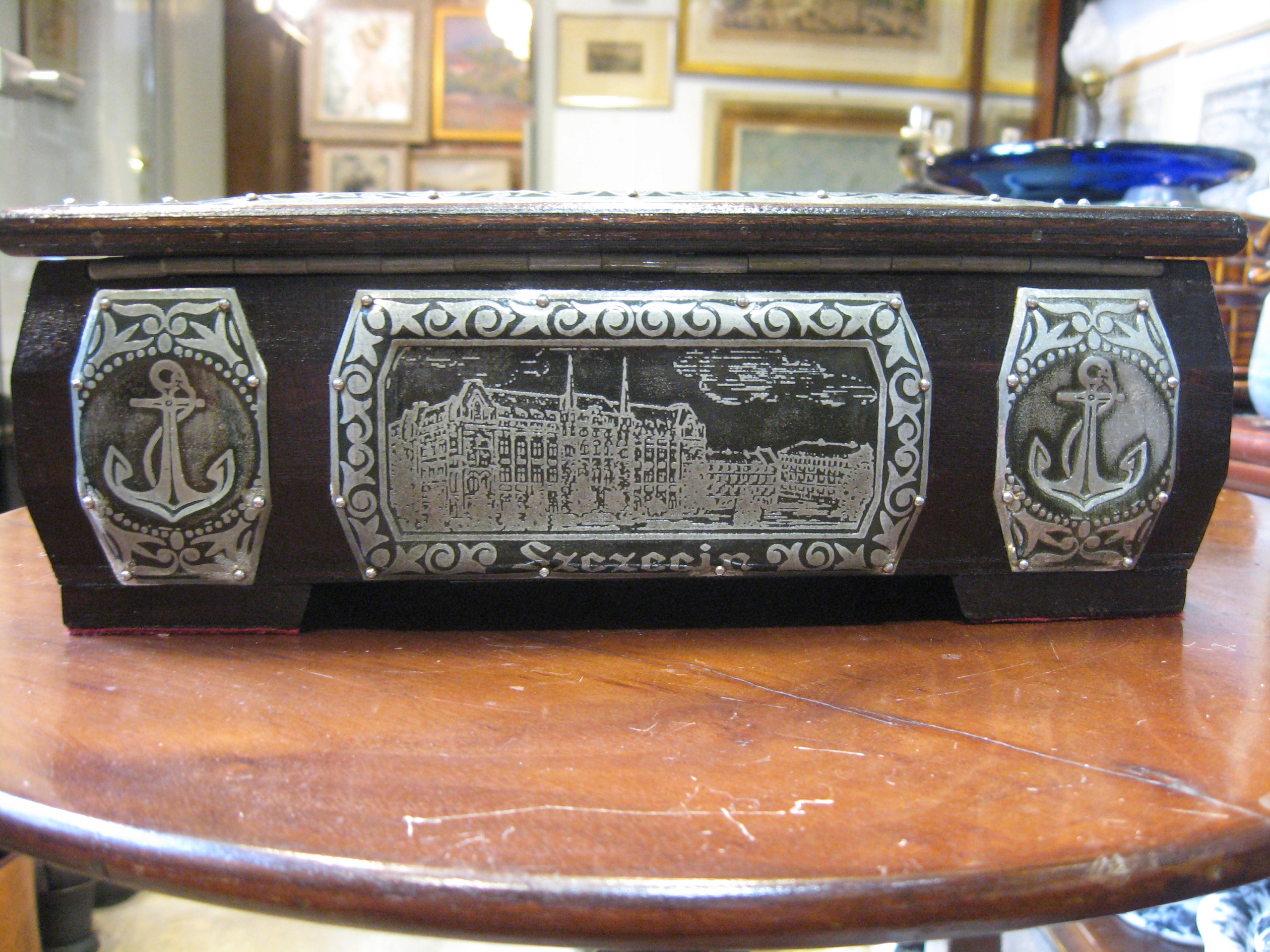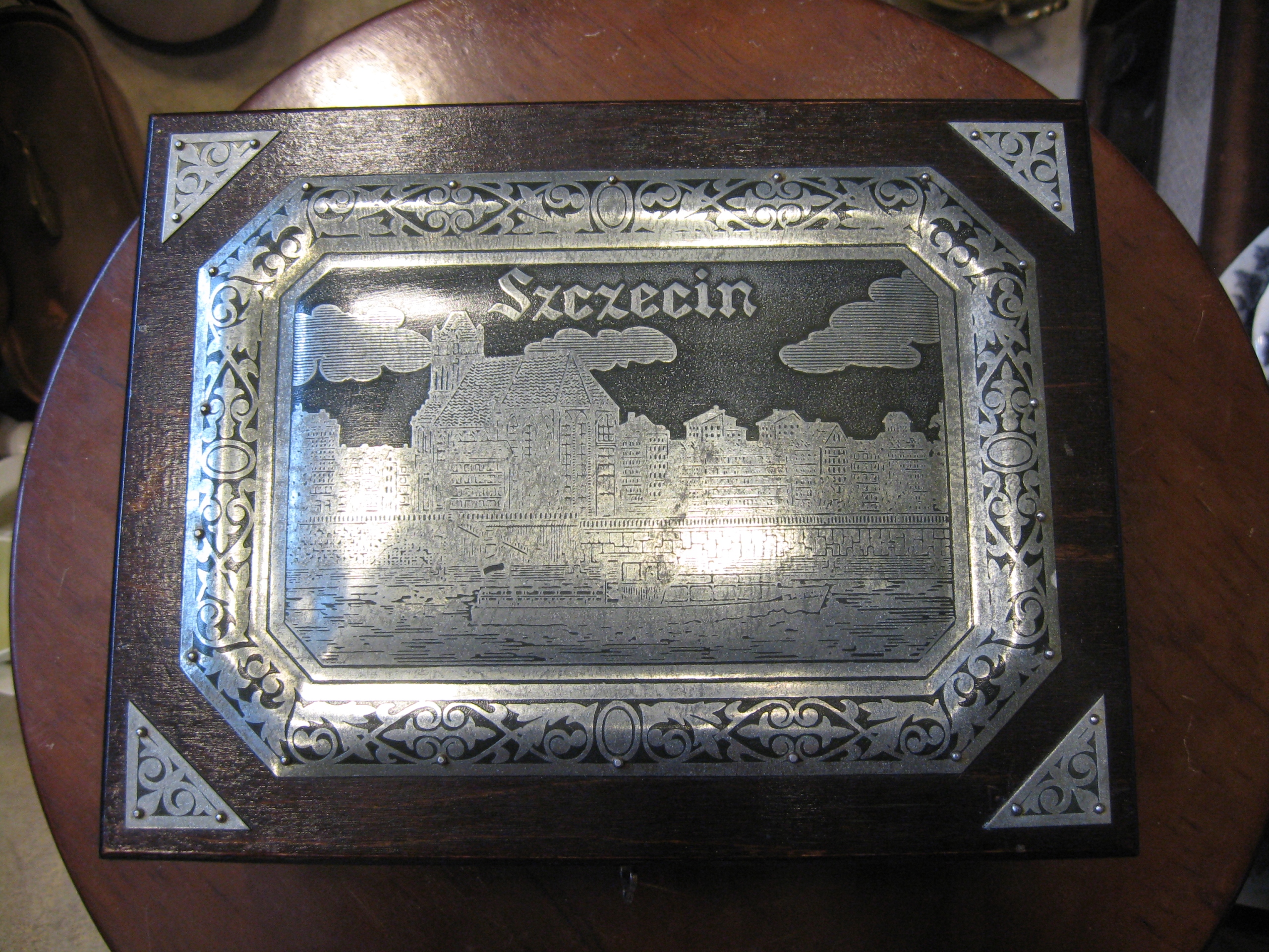 уникальная деревянная шкатулка, украшенная металлической, сделанной вручную, на которых виды zczecin, międzyzdroje и świnoujście были выгравированы с двумя очками, украшенными металлическими, с видами кофе -карт -карт -карт -карт -карт -карт -карт -карт -карт и świnouj Białucha из Warsaw (доска с его данными прикреплена внизу) Коробка с открытой крышкой: 27 см