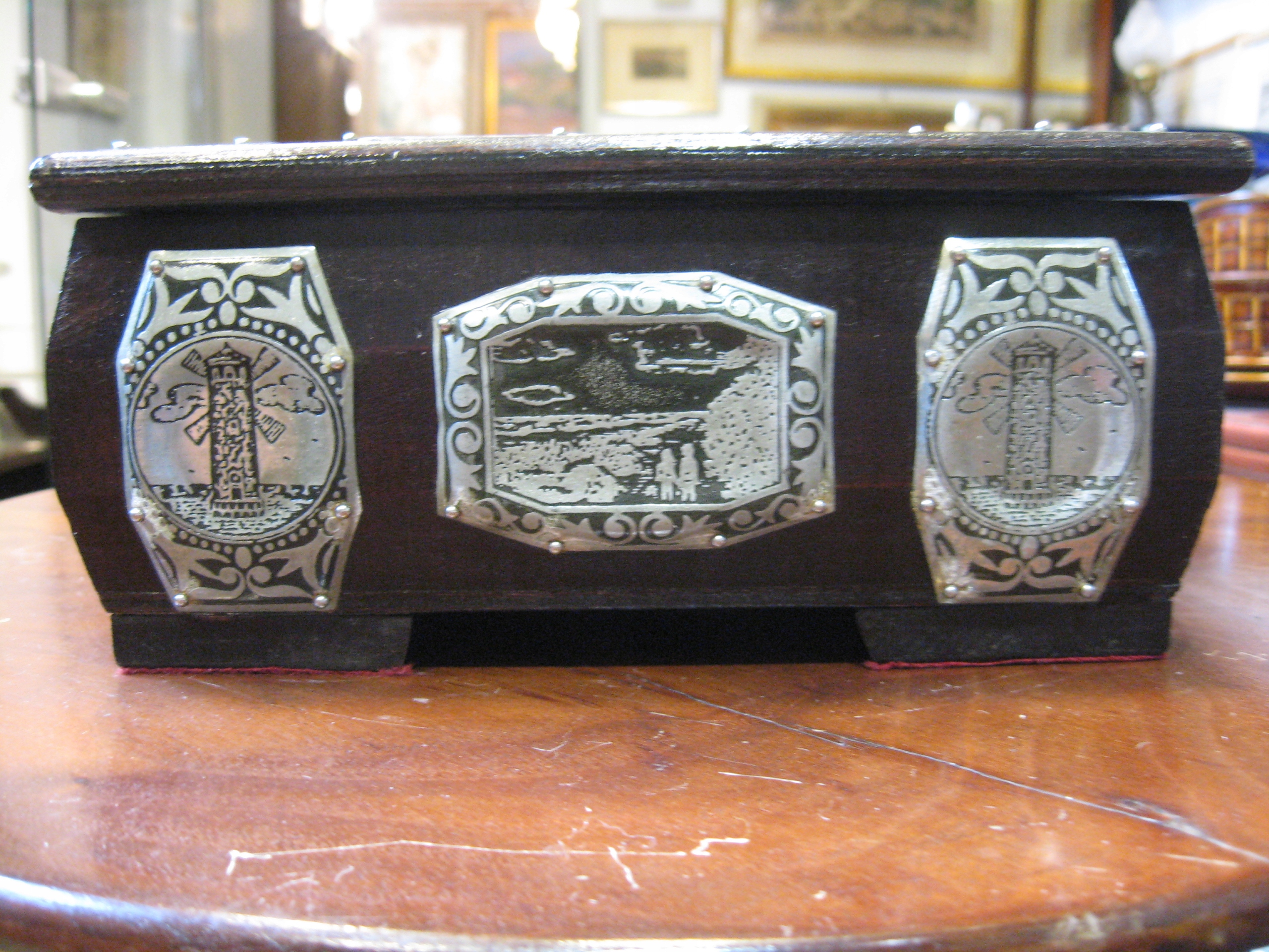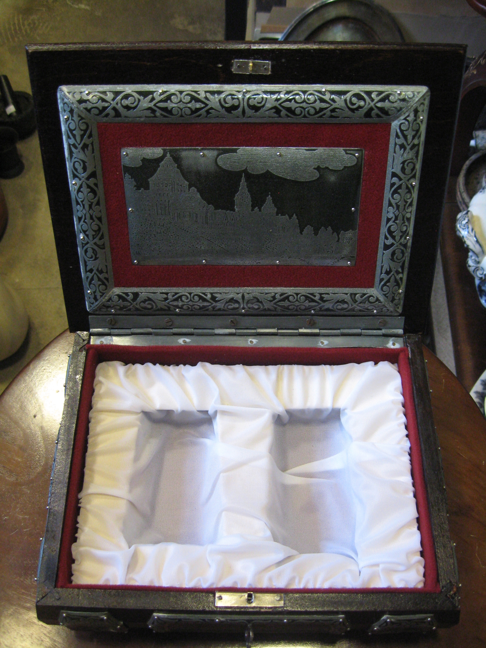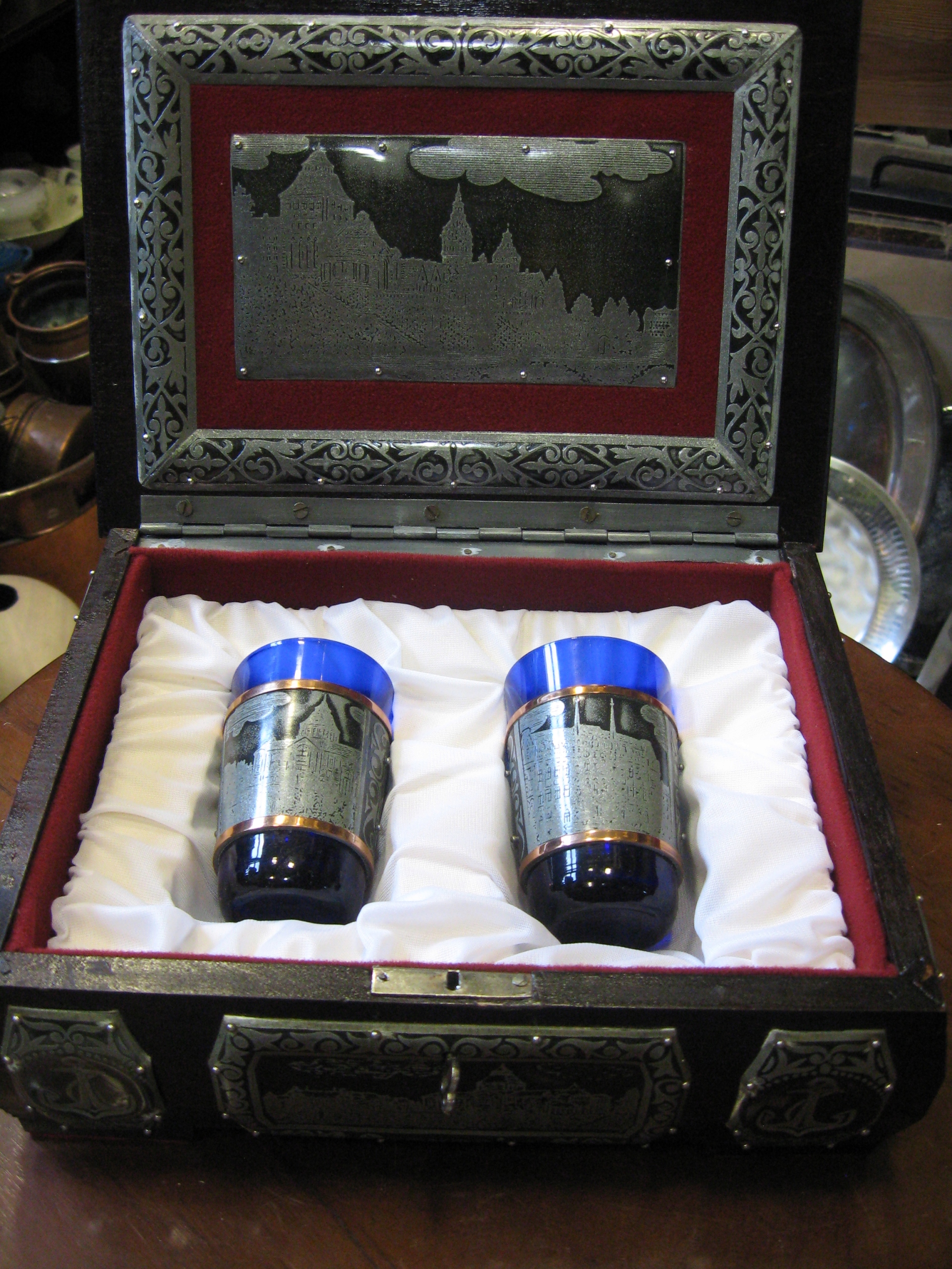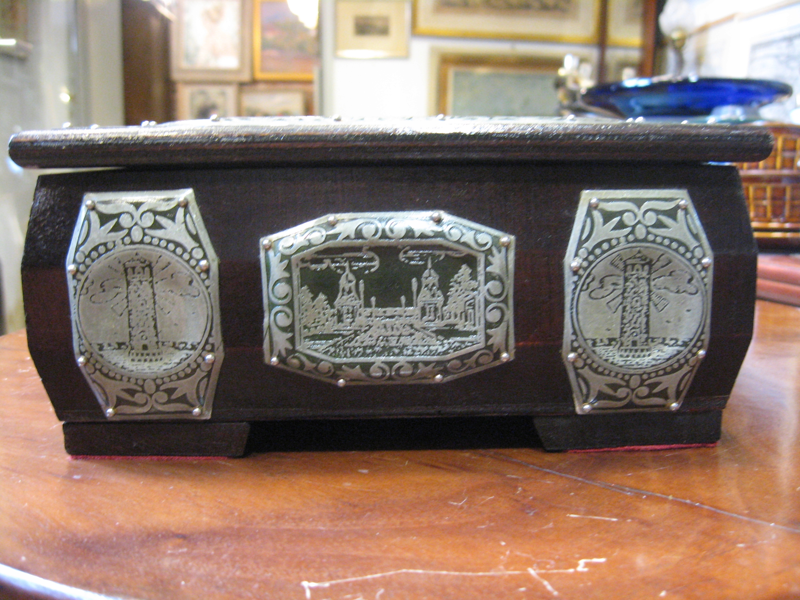 уникальная деревянная шкатулка, украшенная металлической, сделанной вручную, на которых виды zczecin, międzyzdroje и świnoujście были выгравированы с двумя очками, украшенными металлическими, с видами кофе -карт -карт -карт -карт -карт -карт -карт -карт -карт и świnouj Białucha из Warsaw (доска с его данными прикреплена внизу) Коробка с открытой крышкой: 27 см