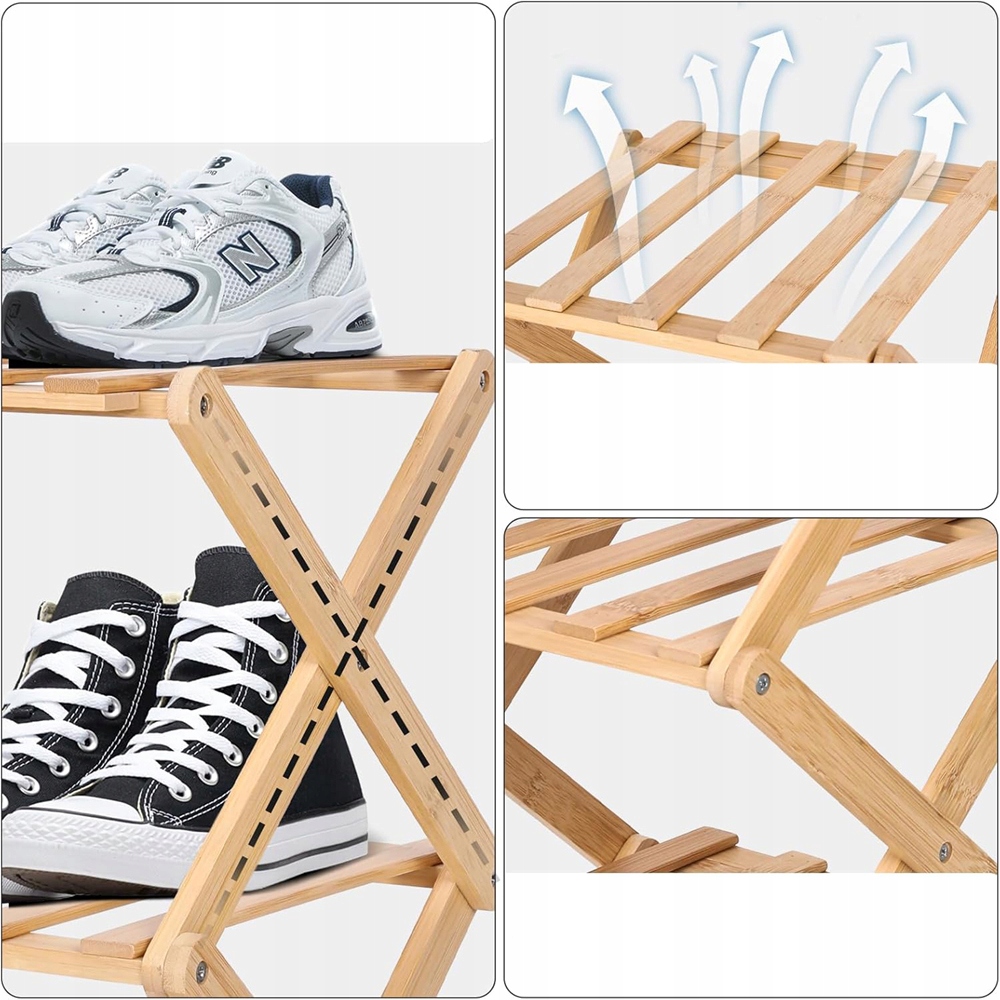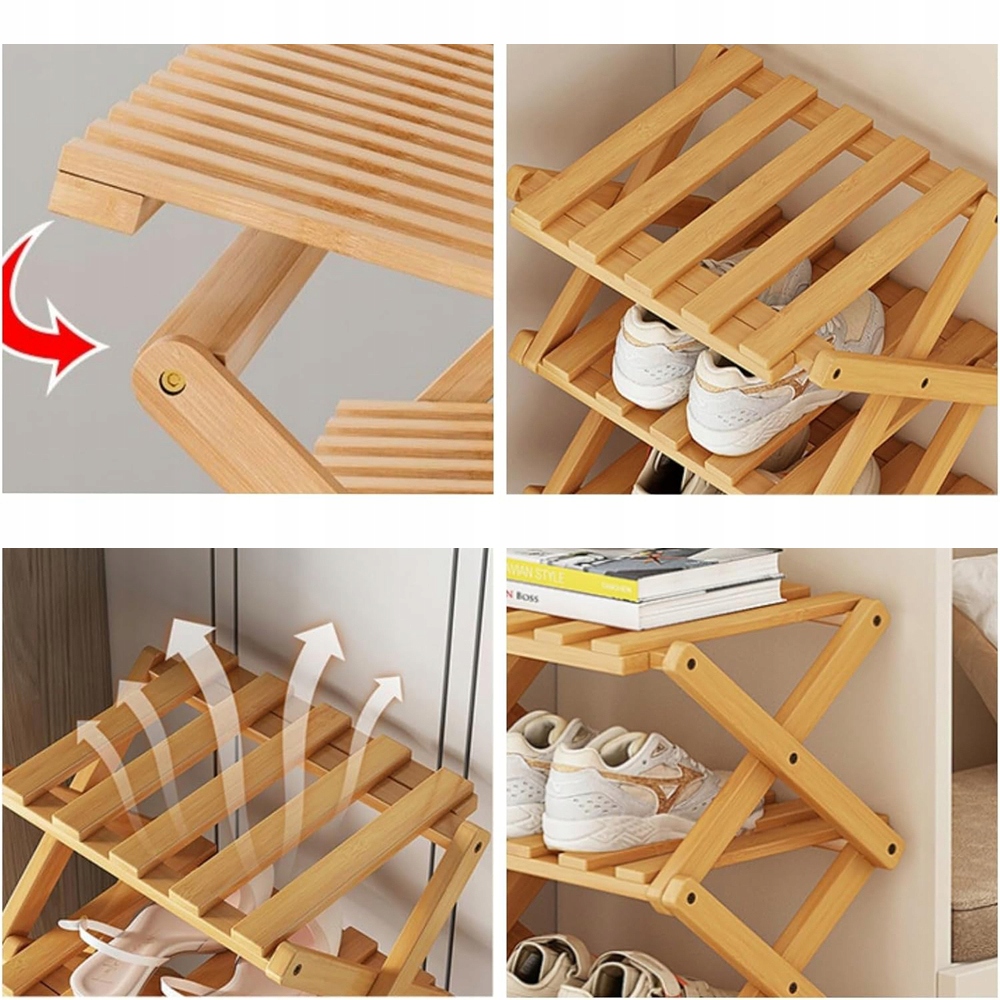 Изготовлен из бамбука, прочный и долговечный, может удовлетворить ваши ежедневные потребности в хранении всех видов обуви. Утолщенная, складная и прочная рама обеспечивает большую несущую способность.