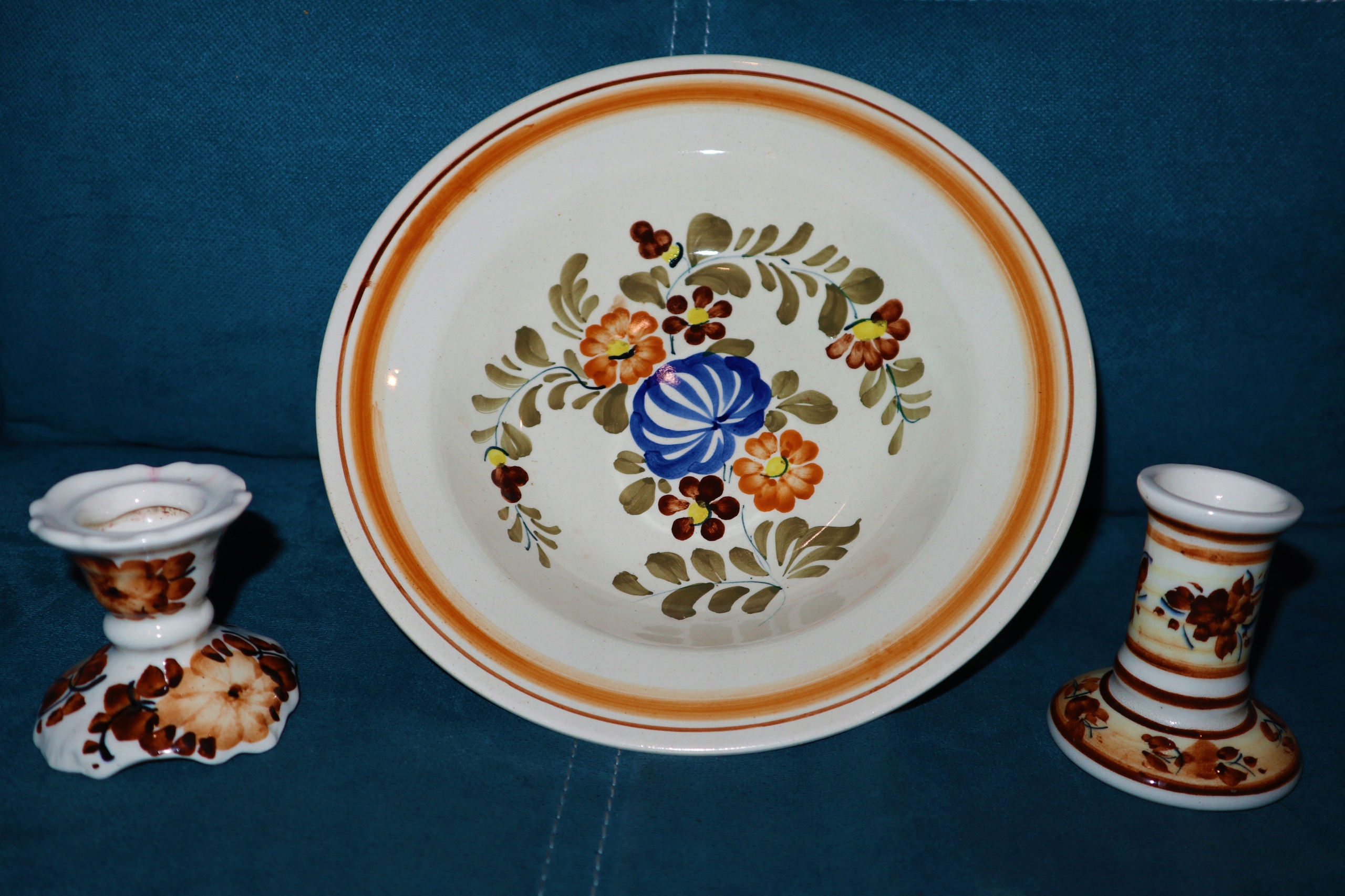 Красивая декоративная тарелка до 25 см, высота 6 см. На обороте дефект производства 5 мм в неприемлемой форме. Бесплатно добавляет две подсвечники, видимые на высоте фотографии 8,5 см и 7 см. Много аукциона