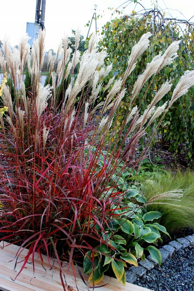Мискантус также прекрасно гармонирует с растениями с ажурными листьями. которые придают им современный вид: как черная сирень или березы.