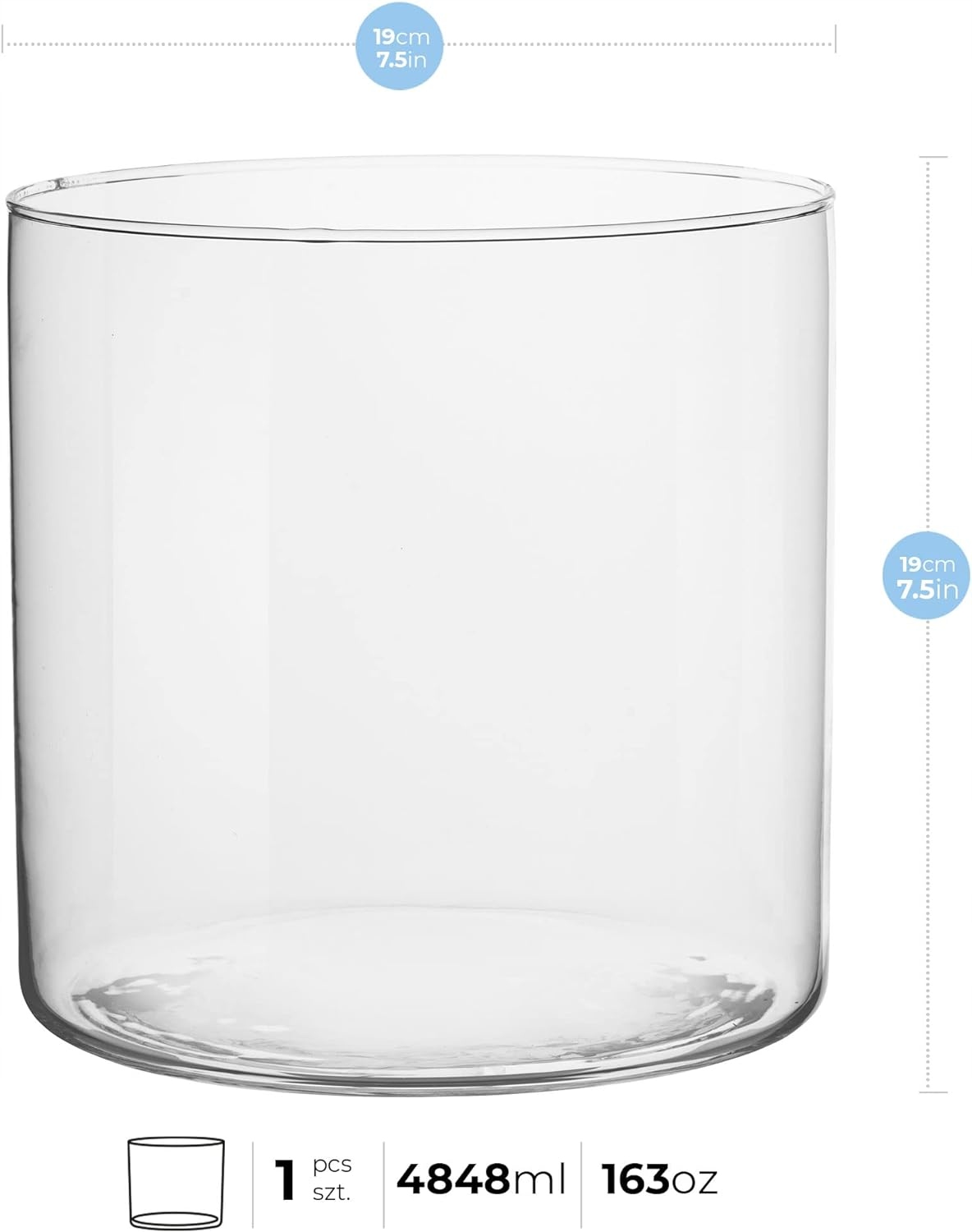 Декоративная ваза Стеклянный цилиндр 19 см для цветов Стеклянный контейнер для свечей Ваза для цветов Декоративный контейнер | Прозрачное стекло | Ø 19 см | 4848 мл