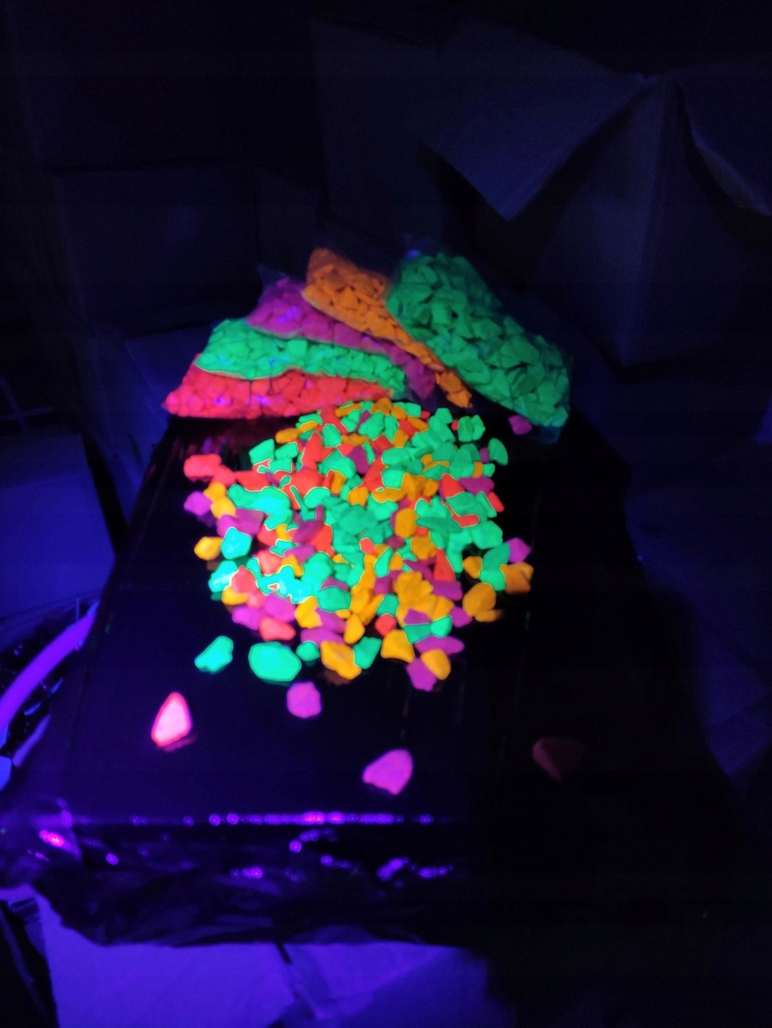 При дневном свете камни имеют яркие неоновые цвета, а в полной темноте, под УФ-светом, их цвет становится более заметным.