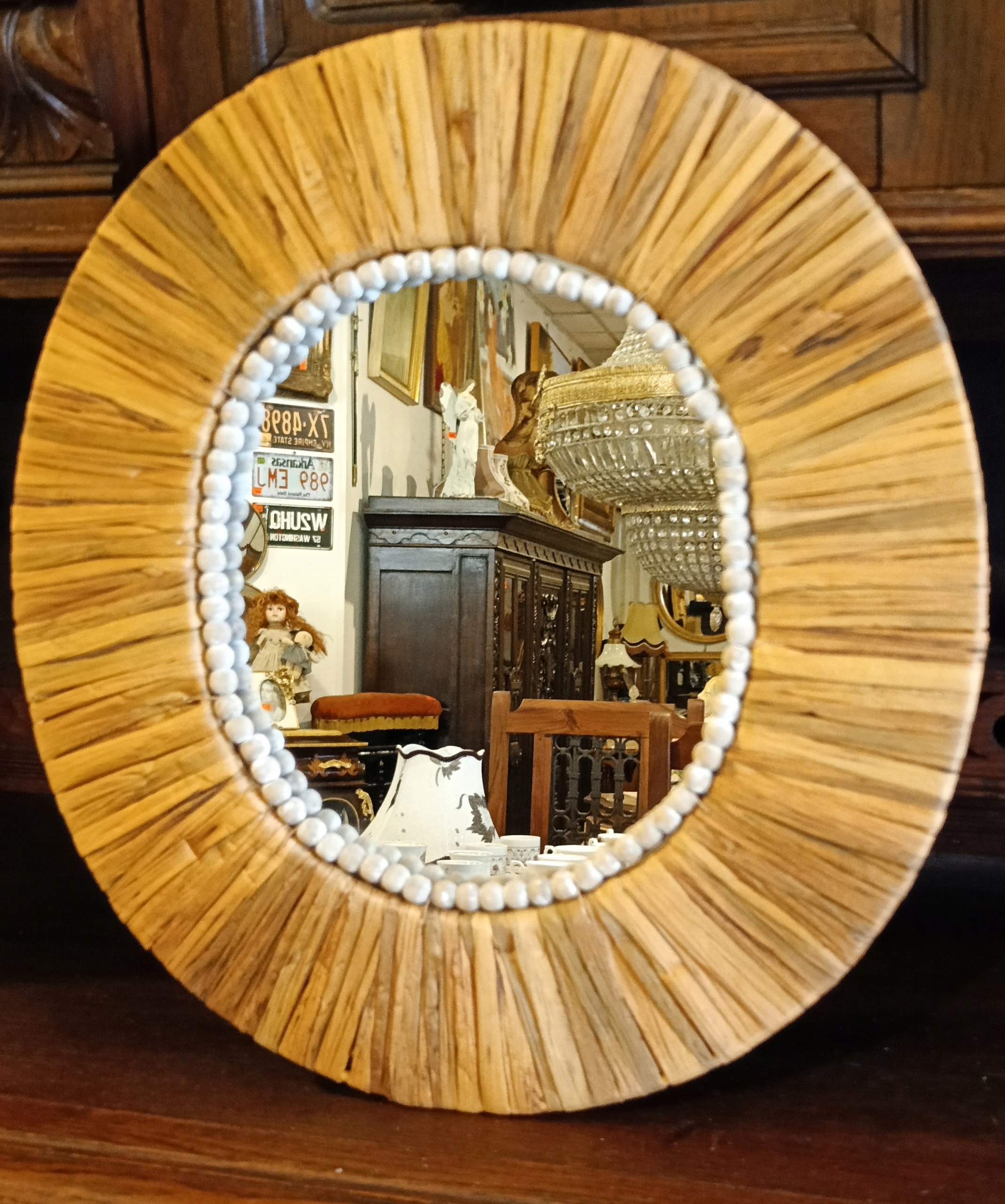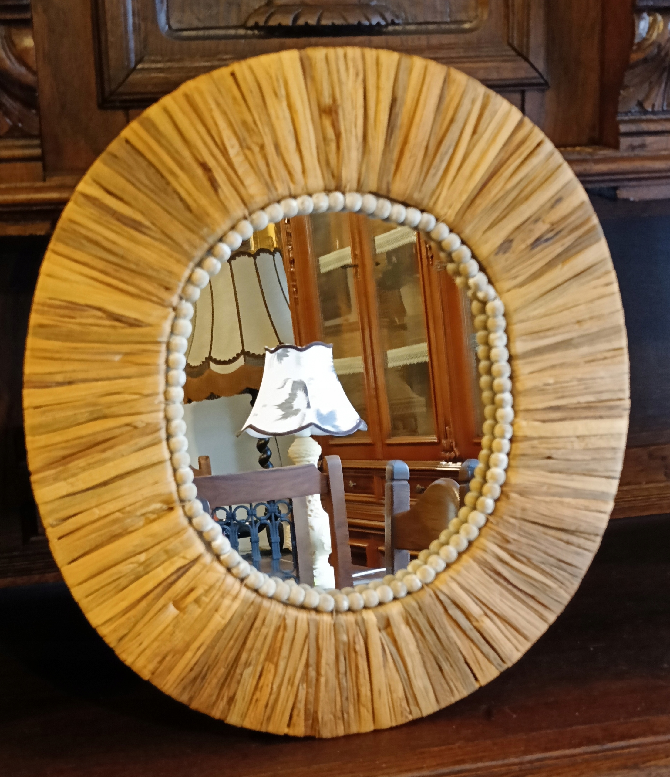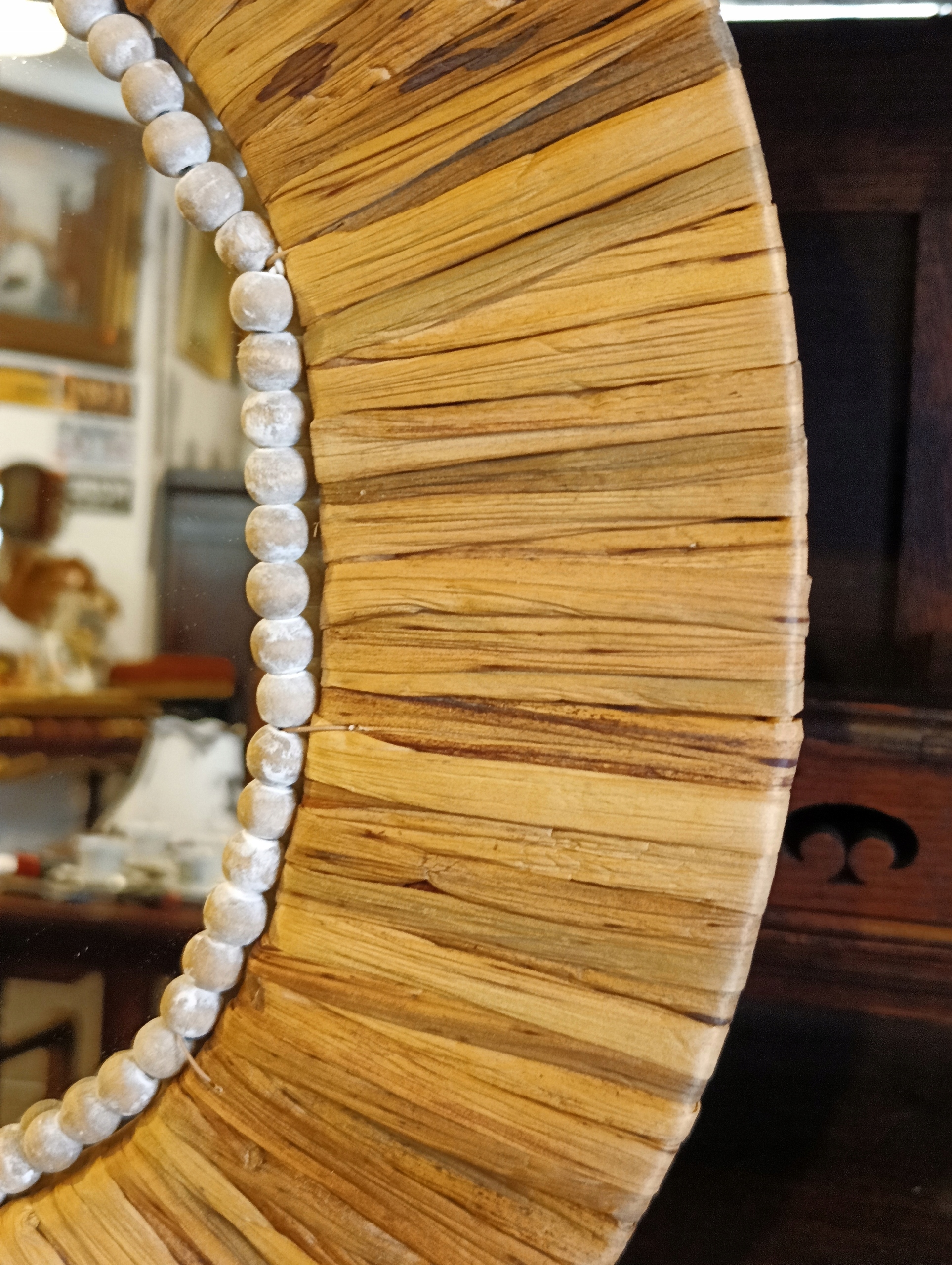 овальное зеркало h1> красиво в своей простоте, золотой. Материал представляет собой металлическую конструкцию и оформление рамы соломенной и деревянных бусин. Прелести своей изобретательностью и простотой. h1>