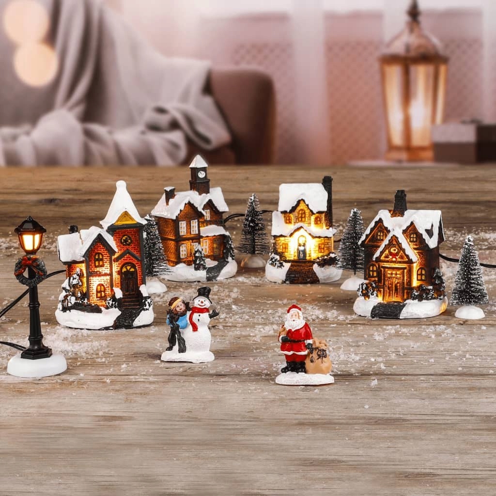 В этом украшении представлены освещенные домики с заснеженными крышами, уличный фонарь, снеговик, Санта-Клаус и другие милые фигурки. Этот набор освещается 5 светодиодными лампами теплого белого света, создавая приятную атмосферу.