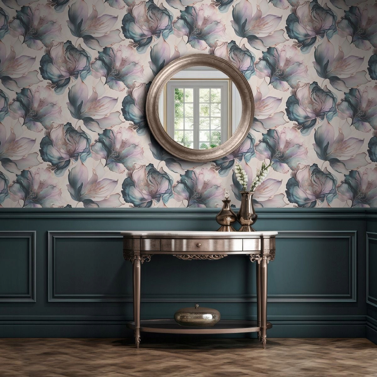Moody Floristic обои с большим рисунком фиолетовых - синих цветов на слегка розовом фоне тонкого мрамора, с золотыми деталями, французская компания Ugepa muriva af0034