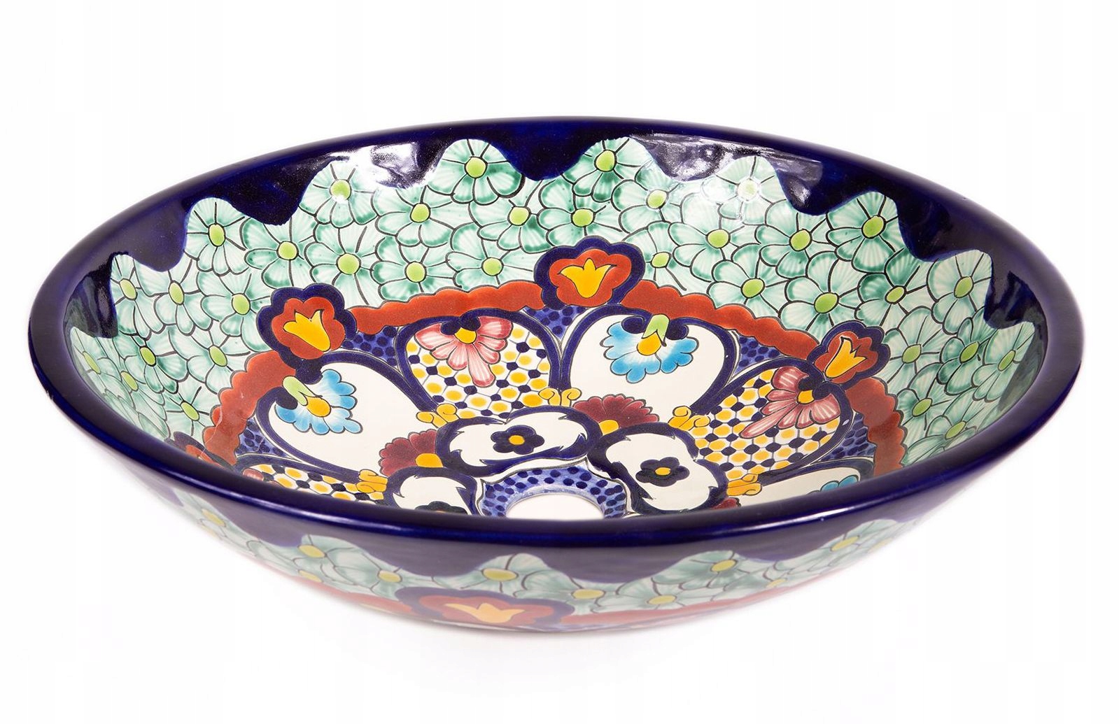 Представленный круглый умывальник из Мексики покрыт декором ручной работы как внутри, так и снаружи чаши, а форма делает узор видимым со всех сторон. Все умывальники расписаны вручную мексиканским художником, поэтому каждый из них представляет собой уникальное произведение прикладного искусства.