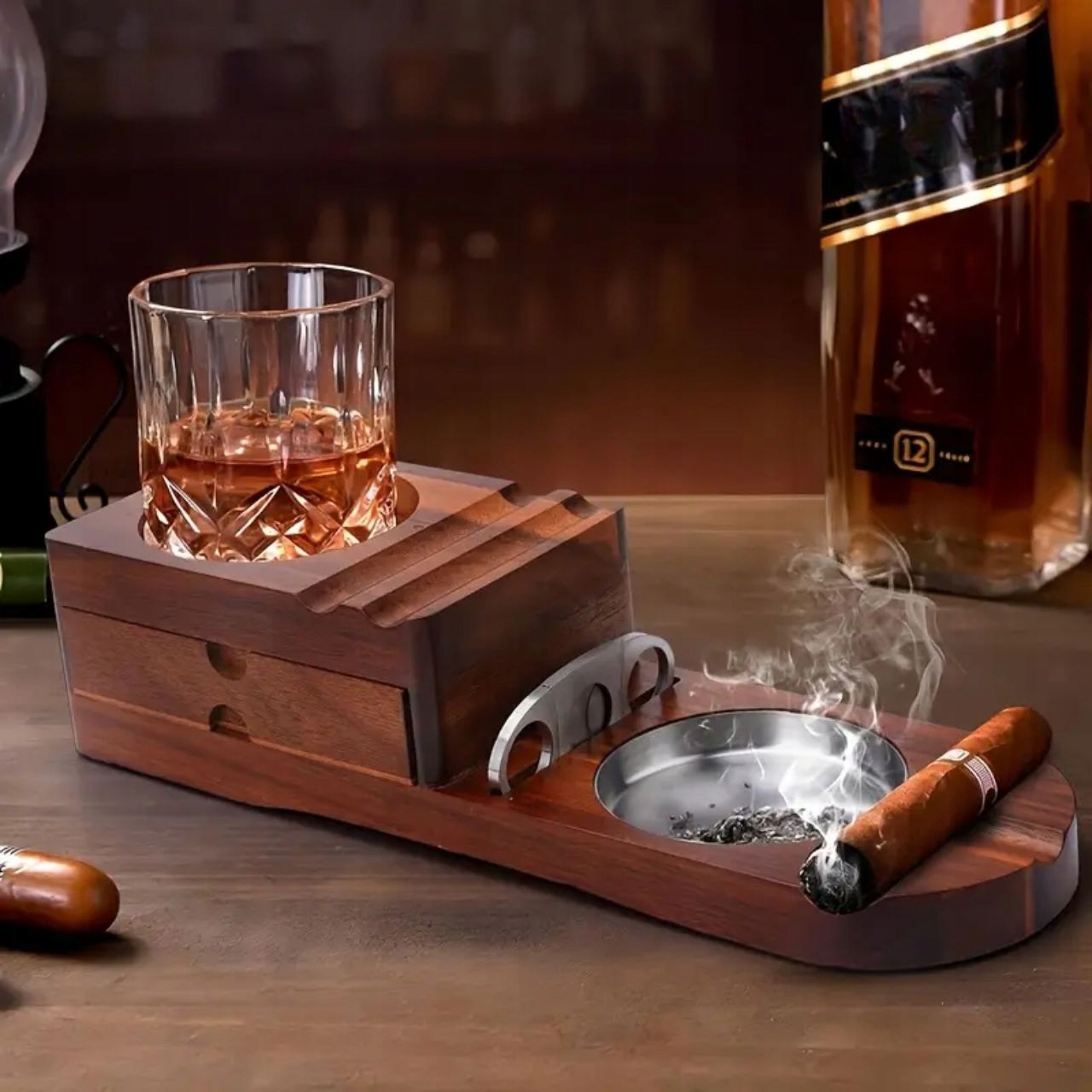 У подноса есть встроенная пепельница, сигара и место для сигары b>, что делает его идеальным для расслабляющих вечеров со стаканом виски и любимой сигарой.