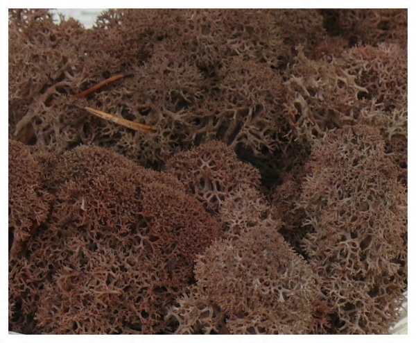 Олений мох — это натуральный лишайник, собранный в лесах Норвегии. Его не выращивают в лаборатории, отсюда и такие загрязнения, как хвоя и естественное изменение окраски нижней стороны растения.
