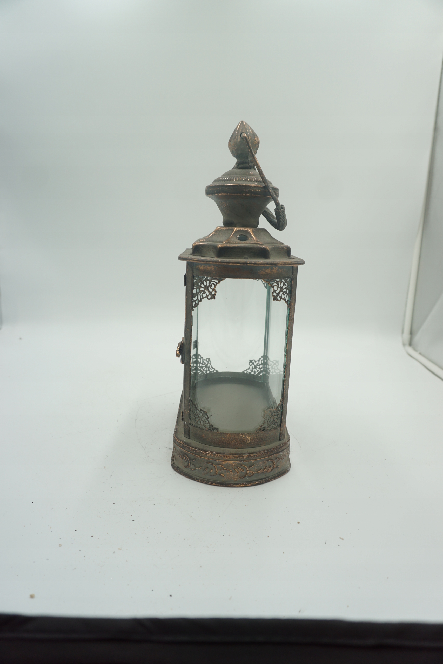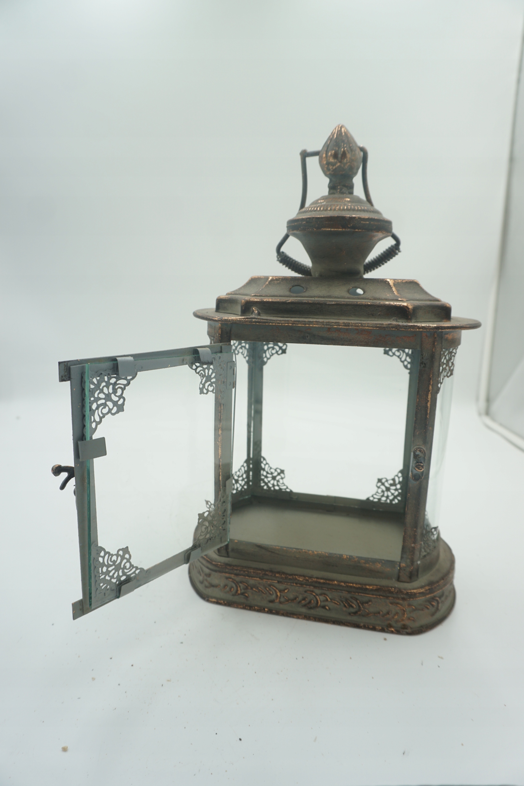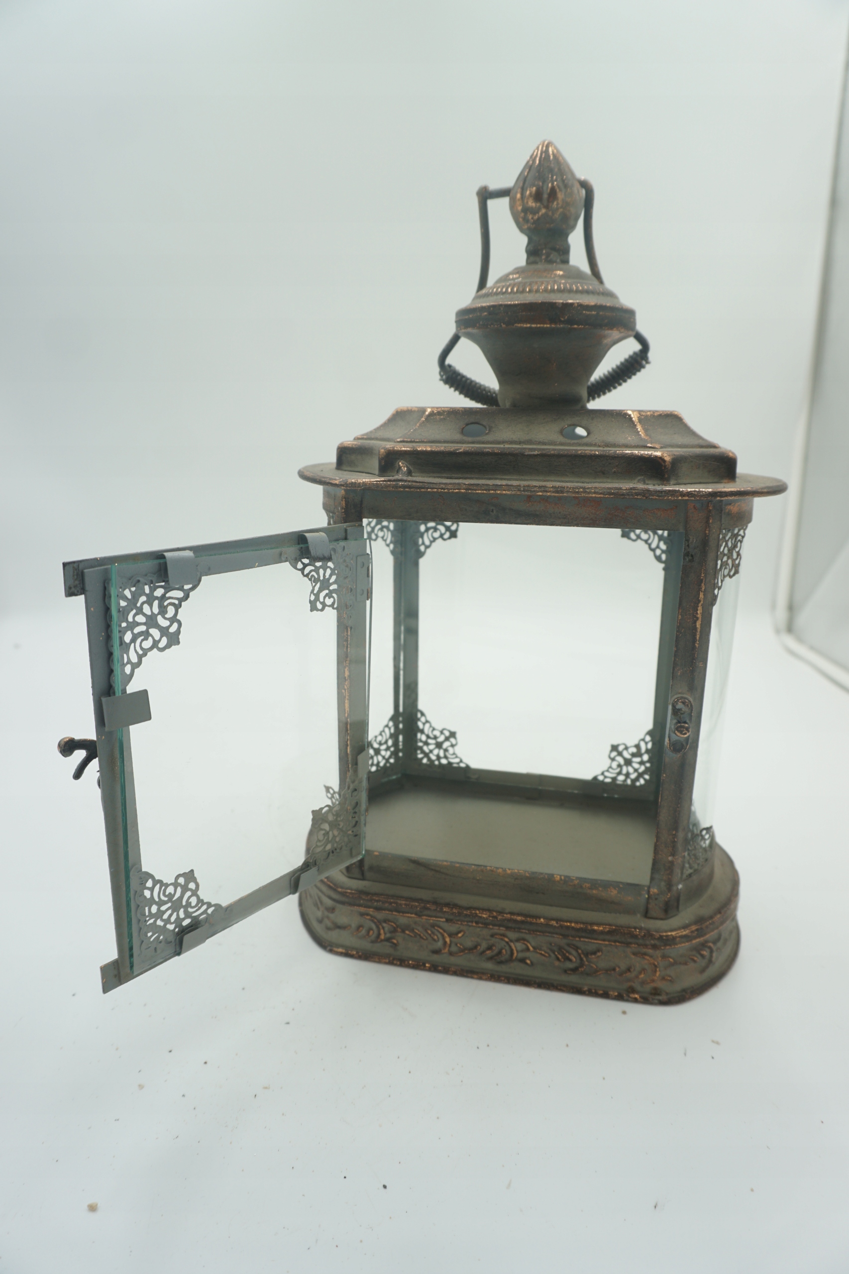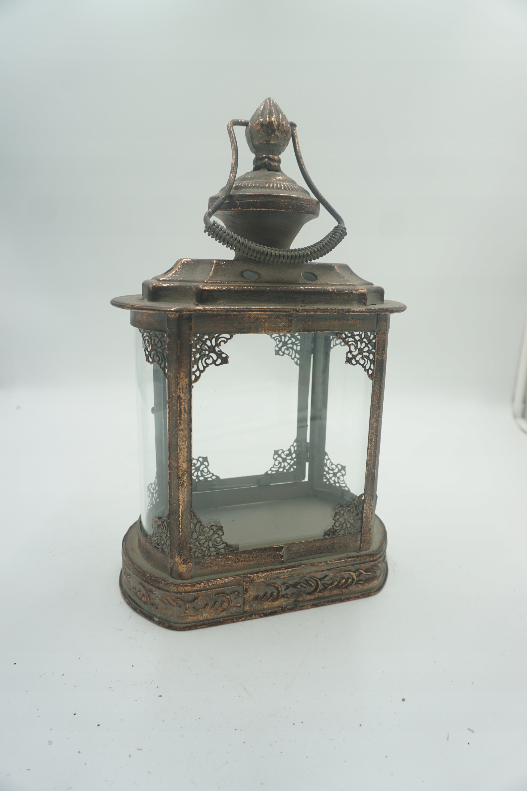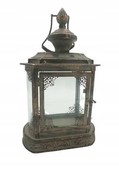 Предмет аукциона - изящный фонарь из металла и стекла, в винтажном стиле. Фонарь имеет декоративные украшения и потертости, придающие ему деревенский, состаренный характер. Идеально подходит в качестве украшения дома, террасы, балкона, сада или элемента оформления на вечеринках, свадьбах и фотосессиях.