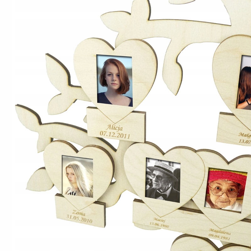 У дерева много ветвей, и мы можем персонализировать его в соответствии с вашими потребностями. Под каждой фотографией мы выгравируем имя человека на фотографии. Дополнительно в багажнике есть место для семейного фото и надписи по вашему выбору. Это может быть стихотворение, цитата, предложение или любой текст по вашему выбору.