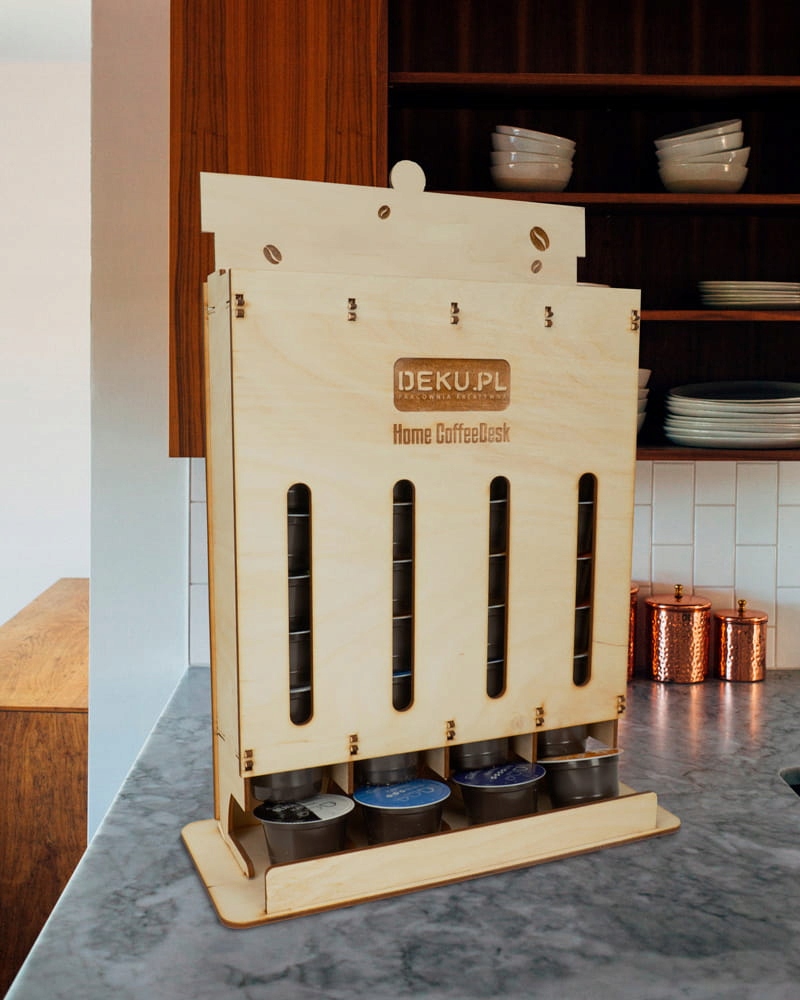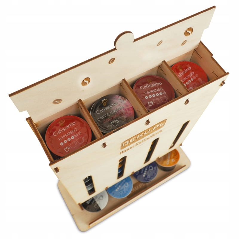 Скрыть свои любимые кофейные ароматы в капсулах в удобной подставке. Практический стенд для вкусного кофе, который содержит до 40 капсул! Он прекрасно работает как украшение в вашем доме, как декоративный элемент и важный элемент каждого гурмана вкусного и ароматического кофе. Вы можете выгравировать что угодно, и благодаря съемной части с гравировкой вы можете использовать ее для любого случая! Часть с гравировкой также используется для закрытия целого и не позволяет капсулам залить, например, во время транспорта.