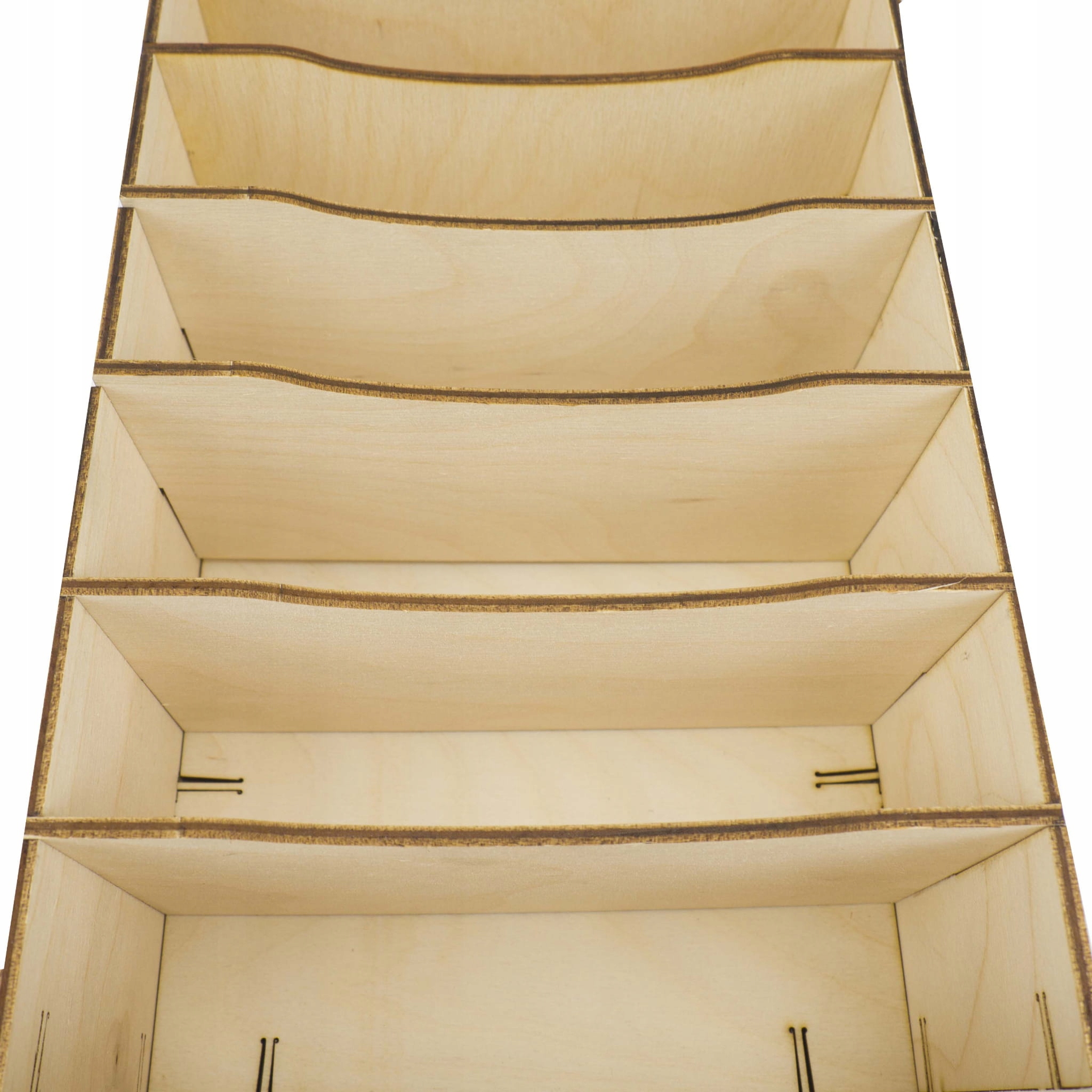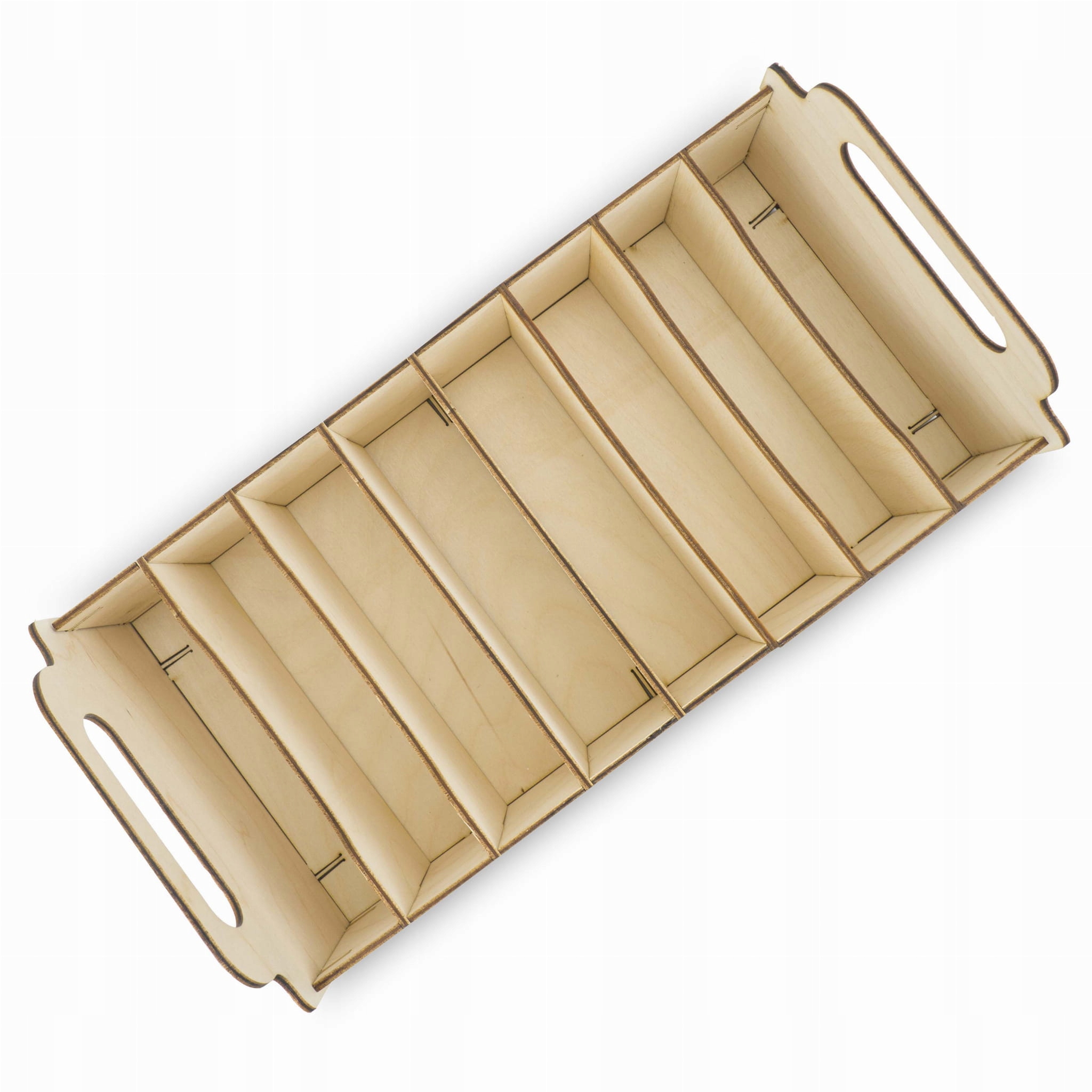 Коробка изготовлена из березовой фанеры толщиной 3 мм. Внутри он имеет перегородки, делящие его на 8 частей. Коробка прочная и очень эстетичная. Имеет две ручки для переноски и более удобного вытягивания или вытаскивания из шкафа или ящика.