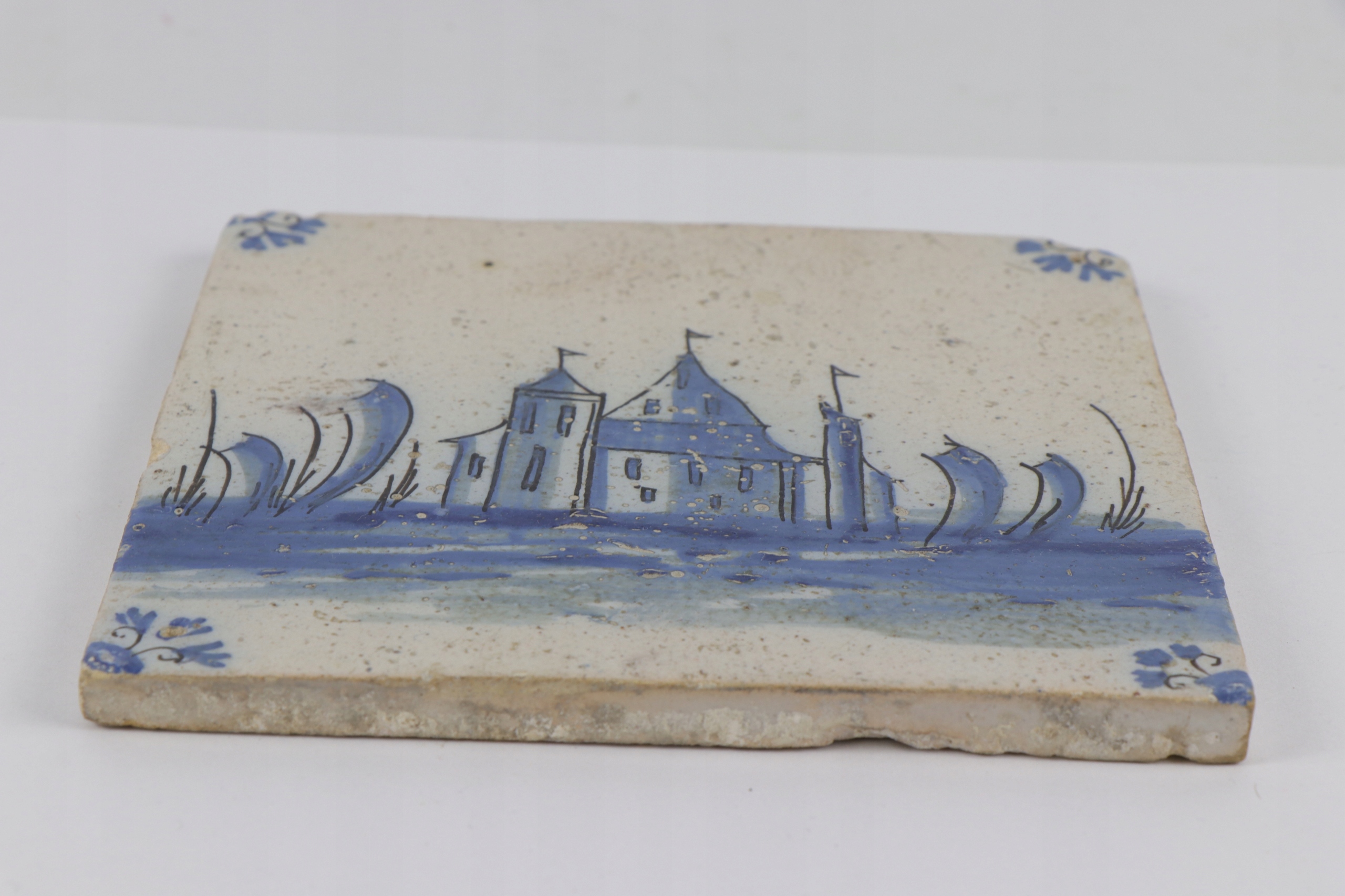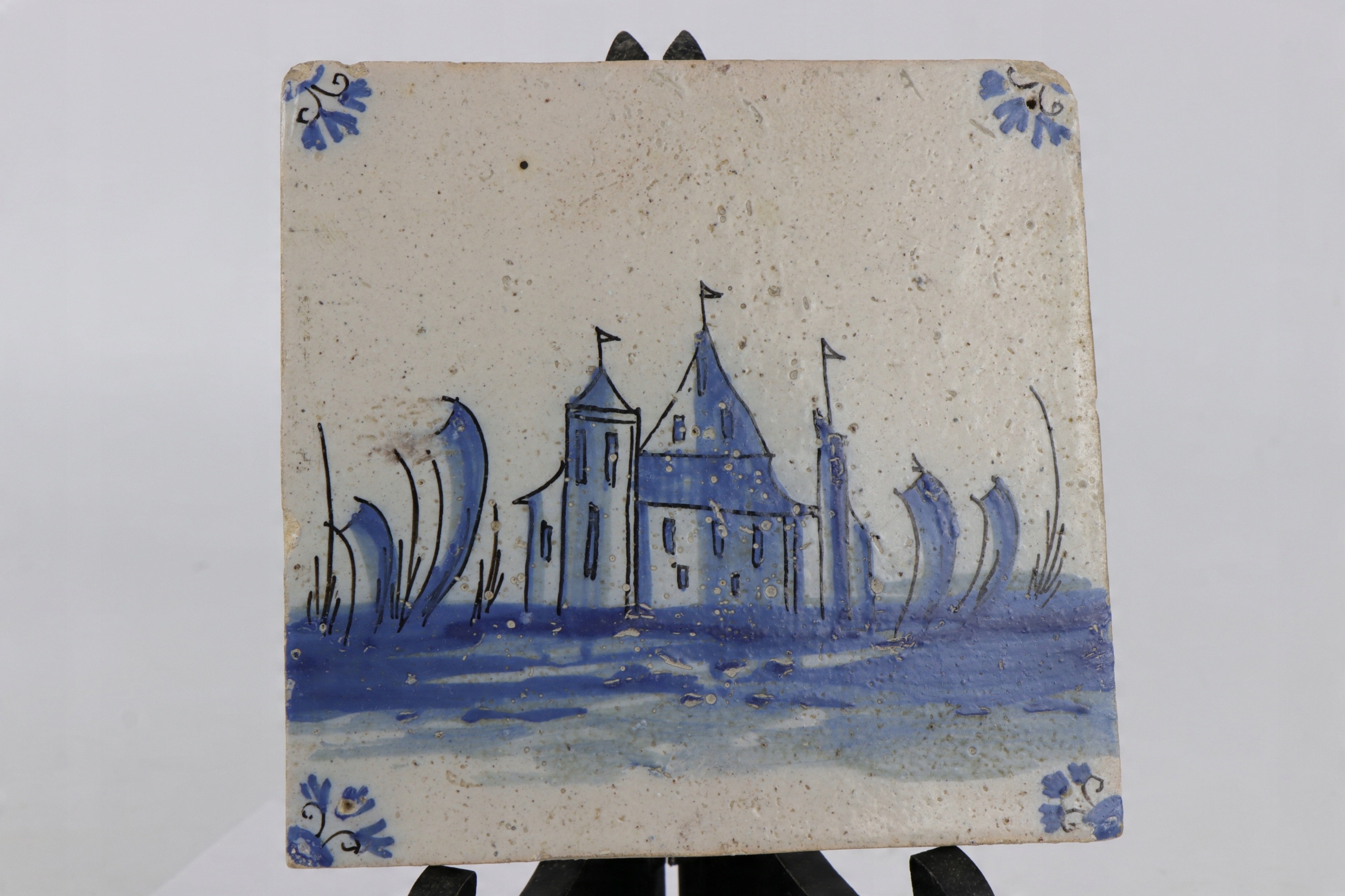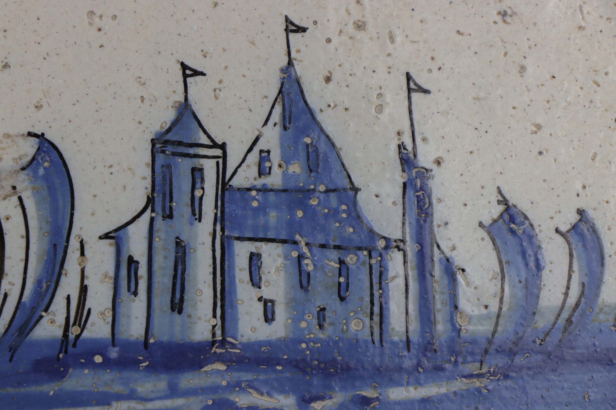 ручная кобальт и черная краска Delft. На плите общая сцена с замком, затопленной водой, наводнением (?). Плитка с двухколорным украшением определенно реже, чем плитки, украшенные только кобальтом. На другом аукционе я выпускаю еще одну подобную плитку.