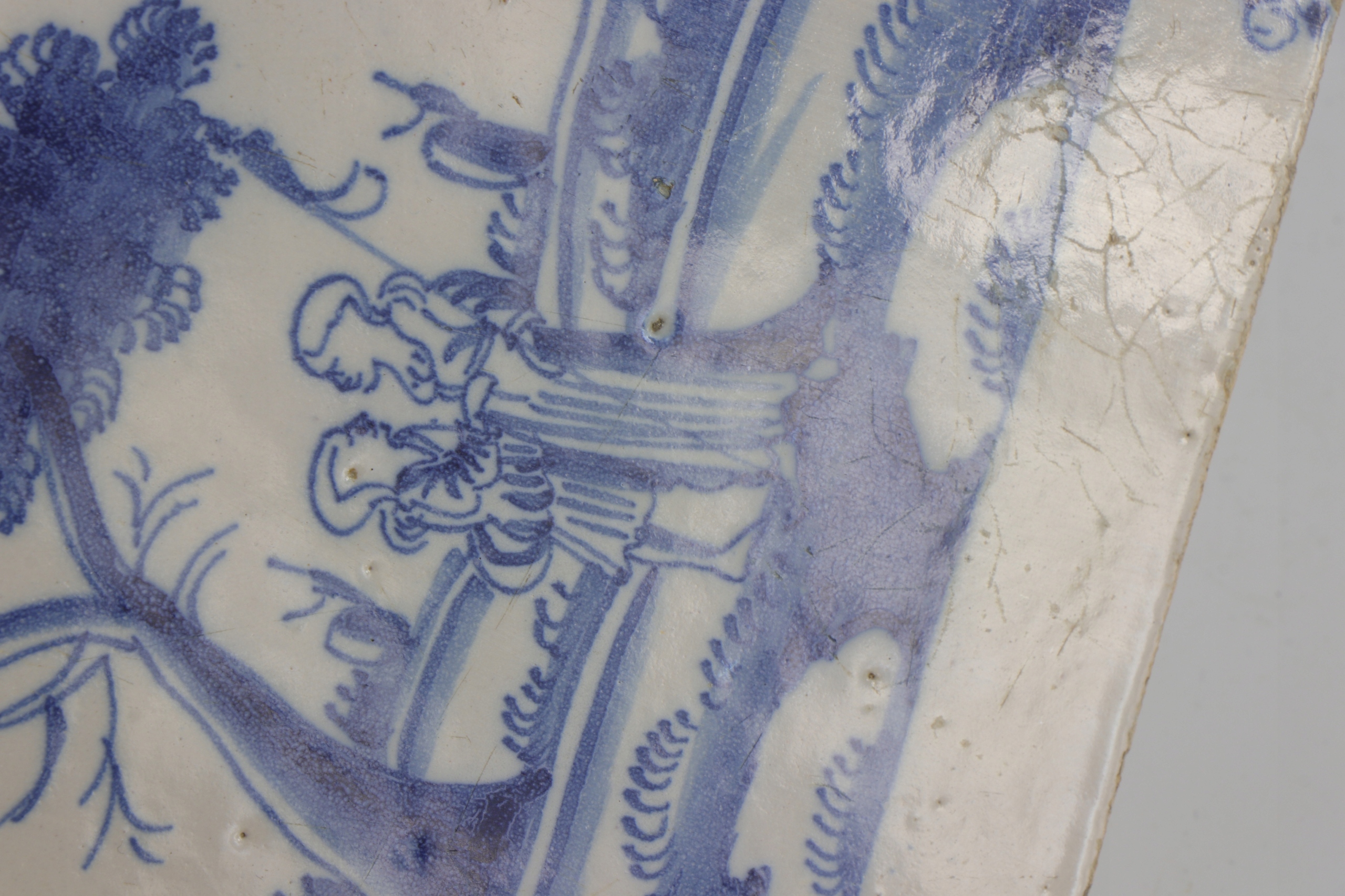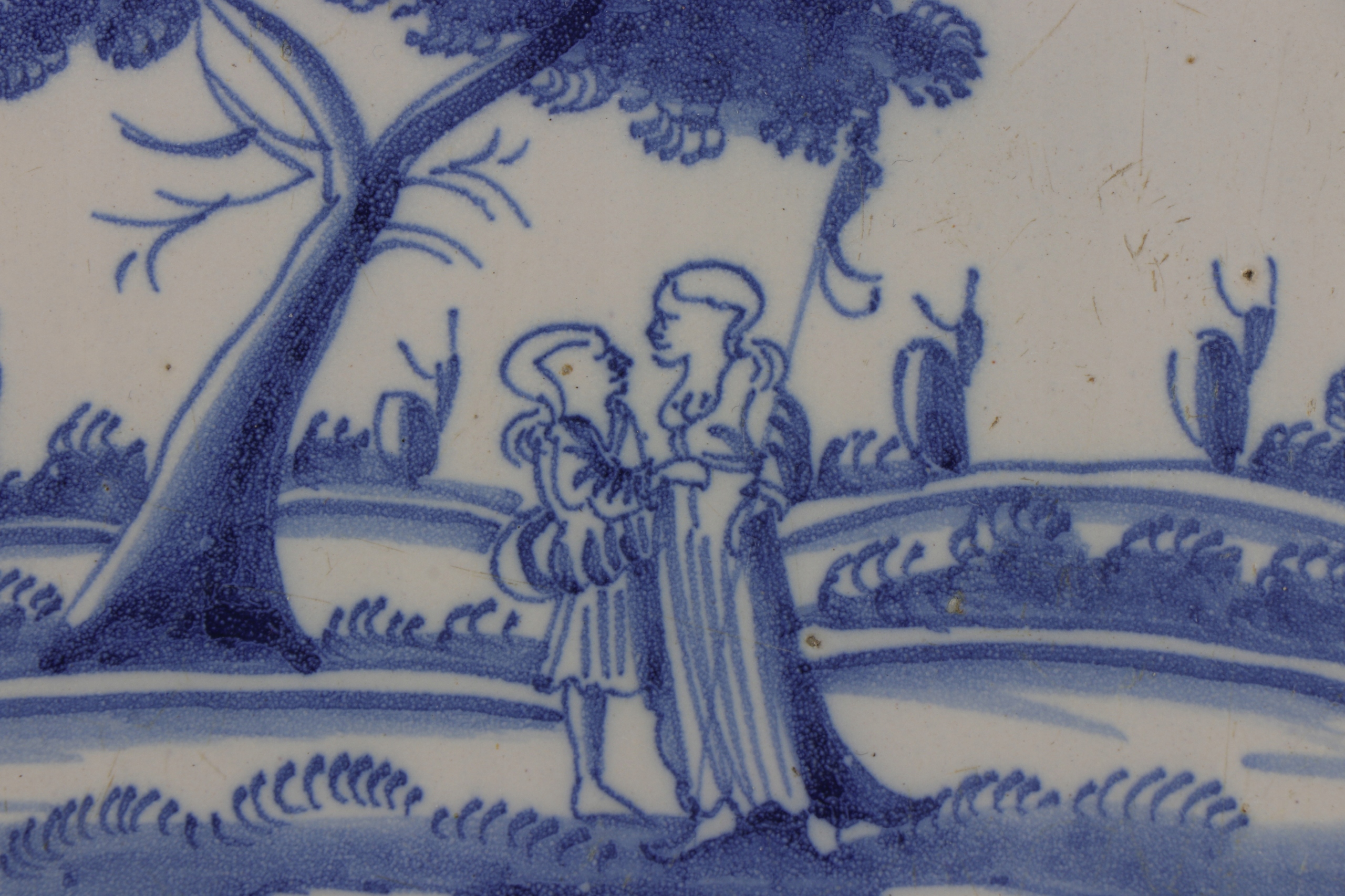 Кобальтовая плитка Delft, расписанная вручную. На плитке изображена жанровая сцена. Предлагаю и другие похожие плитки на других аукционах.